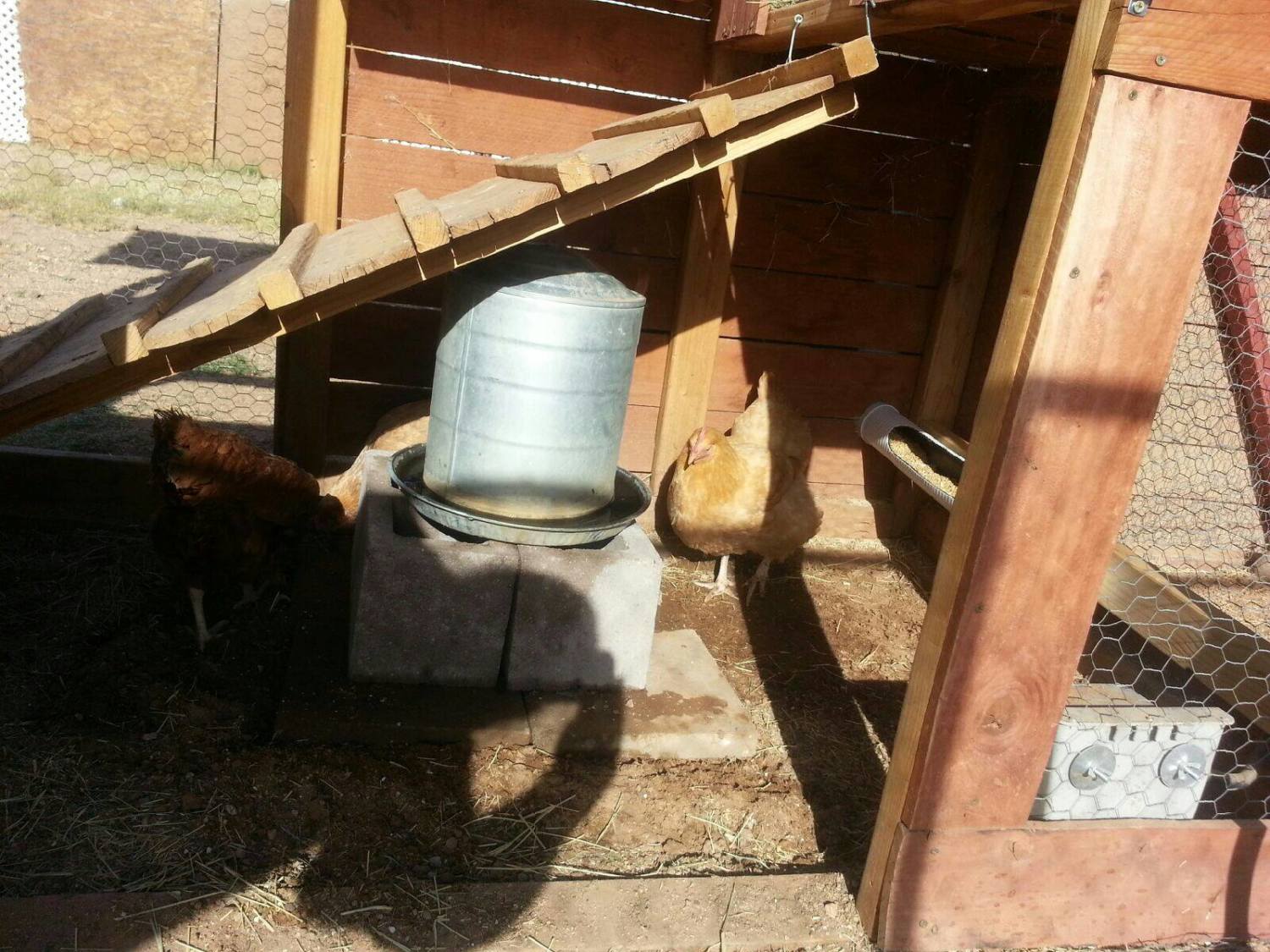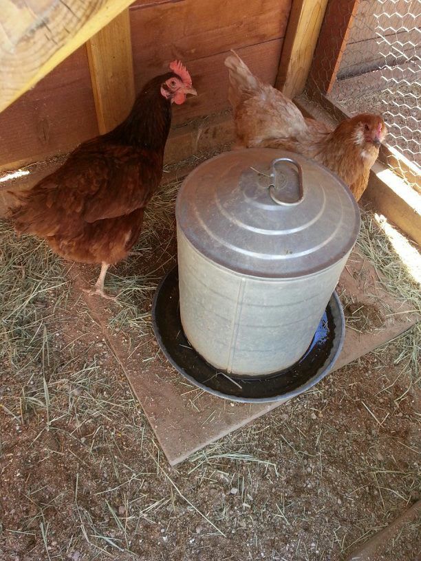 I've asked a few times (in other forums) about our waterer. We have the galvanized can that was given to us by the previous owners when we adopted the chickens. I'm noticing a shiny film on the water after a day or two. We were keeping the waterer on the ground like this first picture but then raised it off the ground (as part of the chicken projects we did a couple weeks ago) like it is in the second picture. I'm not noticing the film as quickly as I did when it was on the ground, but it does still show up 4-5 days later. I also am noticing quite a bit of rust in the water. Is it time to replace the waterer or is there a way to fix this problem or is it just something we as BYC owners in Az have to deal with? I figured maybe some of my Arizona BYC peeps would have a better answer for me.