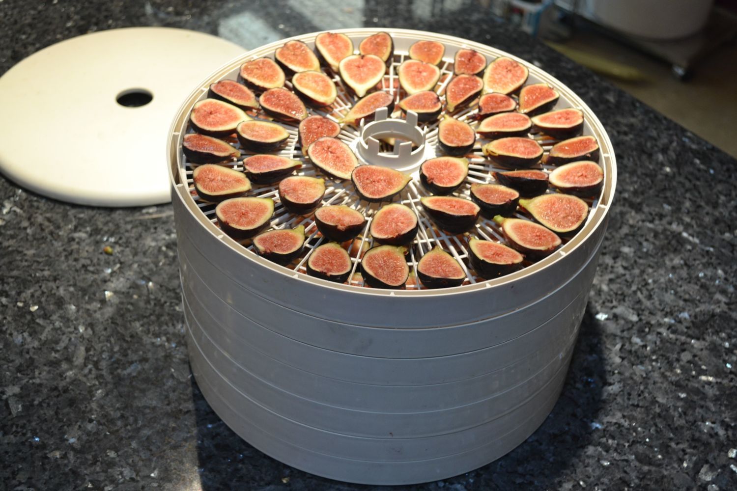 We're in high fig season here! For the past couple weeks we'd been doing a pretty good job of keeping up with eating every ripe fig, but a couple days ago they started ripening in earnest. I picked 8lbs and started dehydrating them. We've gotten 2+lbs each day since and both dehydrators are working hard with this new moisture in the air. With any luck, we'll continue getting figs up through the first frost. Fresh figs, truly one of the great gifts in life.