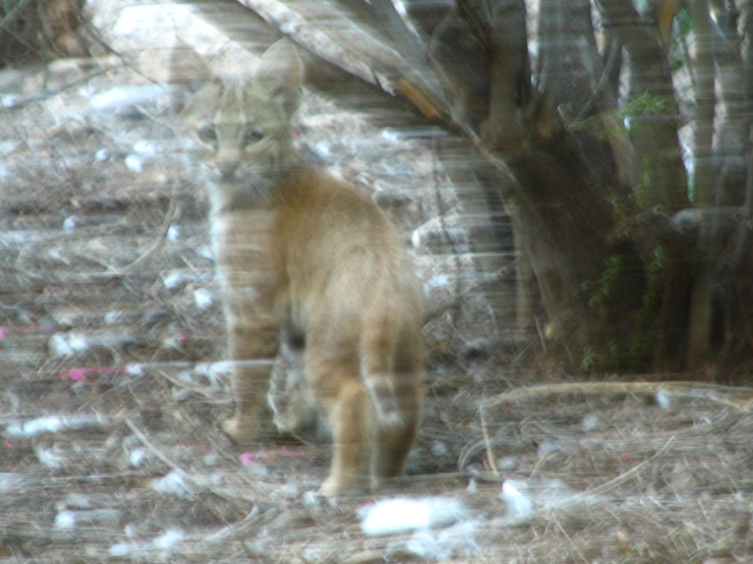 Her kitten was heading off to the side, so I went out the door to get a shot. Unfortunately, my camera was not cooperating. I think there wasn't enough light for the setting I had it on, or maybe the batteries are getting weak, so it is blurry. And the kitten was not hanging around, it was heading for cover. However, mom did not leave until I waved my arms at her and told her to scat. As beautiful as they are, I do not like that they feel so comfortable around here.