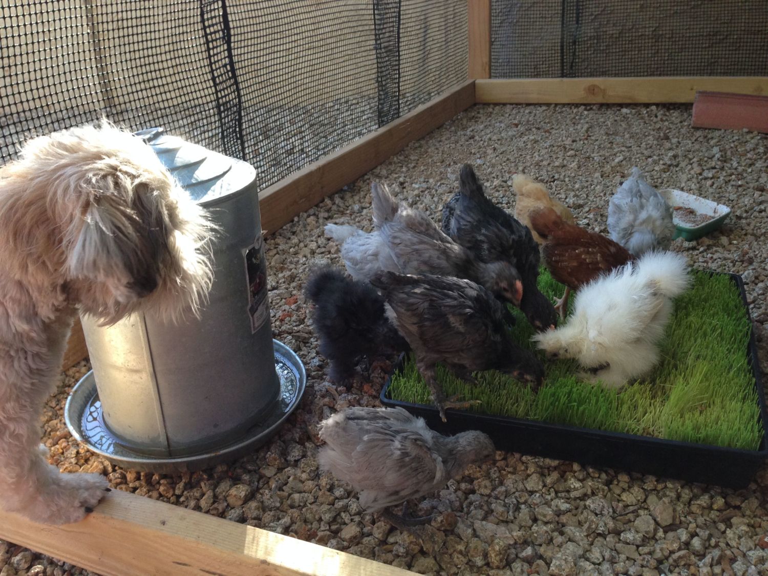 As I was transferring chicks from lawn back to garage brooder box I left the screen lid off. They all can fly to the top edge of the brooder without the lid now. Only two ever attempt it on a regular basis. Of course my most adventurous one vying for top hen escaped over the top and discovered the dry feeder next to the box and was happily eating away!! Little Bugger! We got her back in and I remembered about sprinkling some dry feed over the ff. I did that and they seemed a little more interested.