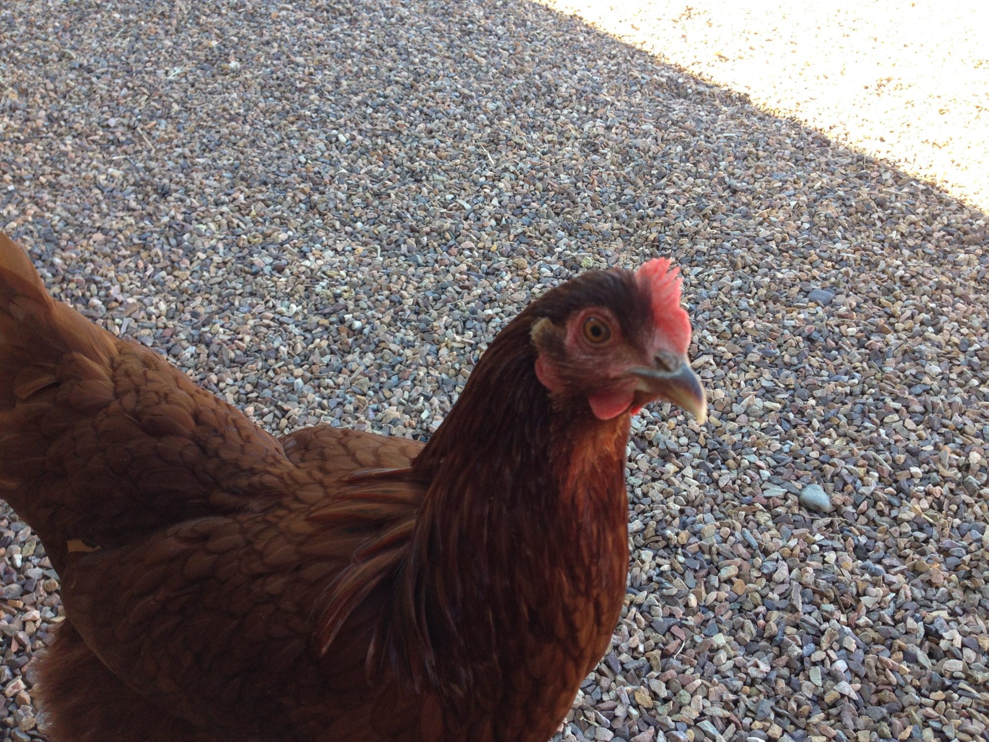 Rachel our Rhode Island Red out strolling. I think she was the first egg layer as when I found the egg they were all roosting for the night and she was in the middle with her wings over the other two. Not sure if that means it was her but since it was a brown egg it was either her or Monica.