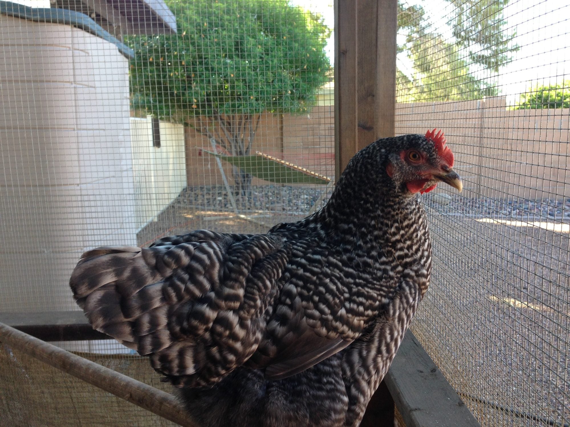 Monica our Barred Rock keeping watch over the yard. Pretty sure she is the top of the pecking order.