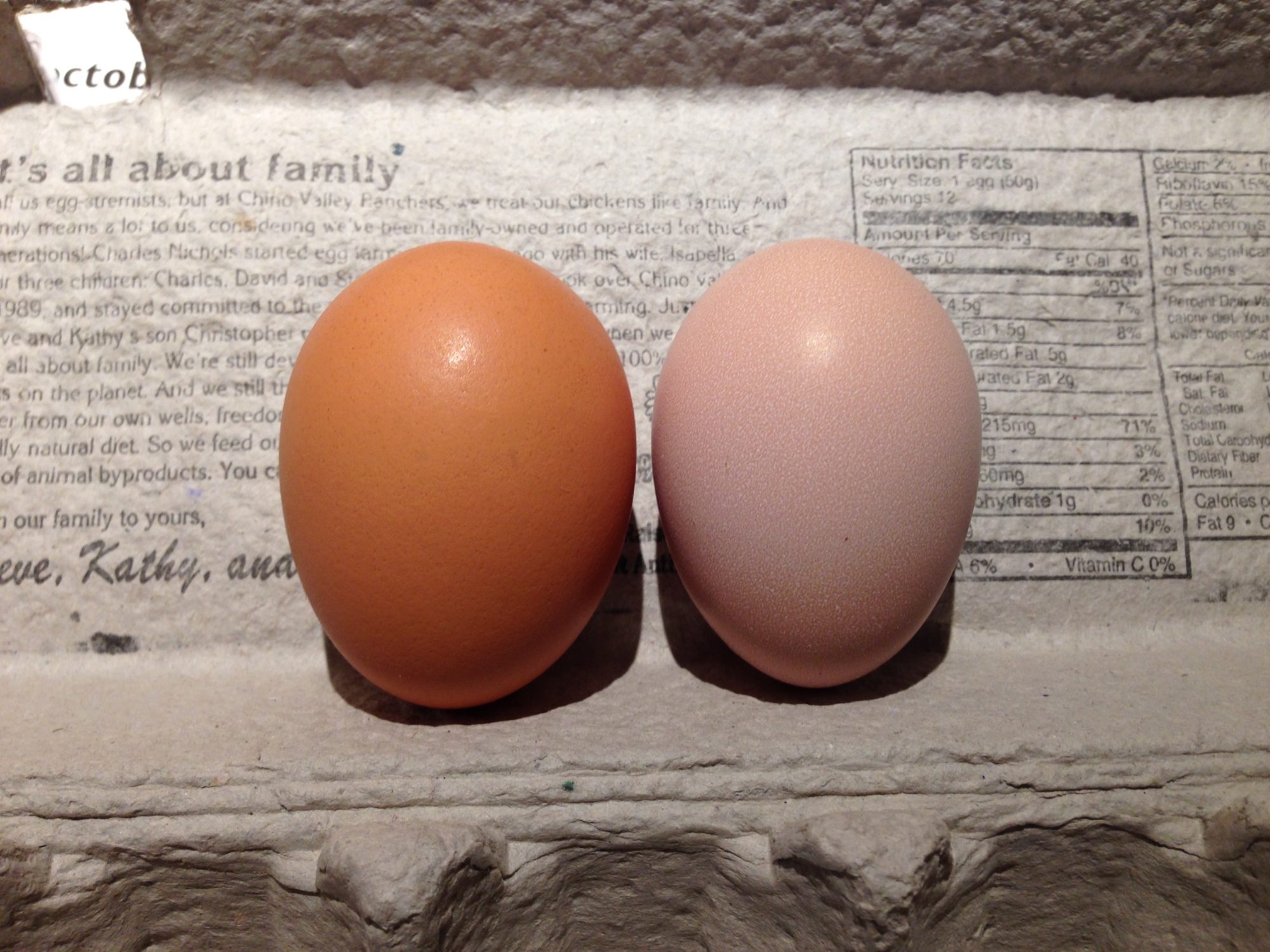 Our first eggs were pointed at the smaller end... Along with smudges of blood.. Then about 1 week into laying they started to round out. Just so beautiful... Thank you for posting photos...We got our second egg yesterday. It appears only one of the girls is currently laying. Here is a comparison of a store bought free range, cage free, pastured raised organic egg and ours. Not quite as big yet but I was surprised that this being only the second egg it is very close. Ours is on the right. Looking forward to another week when our Amrerecauna starts laying the blue eggs. I had read many stories of the first eggs being soft shelled and small. We will be having egg sandwiches for breakfast tomorrow!![]()