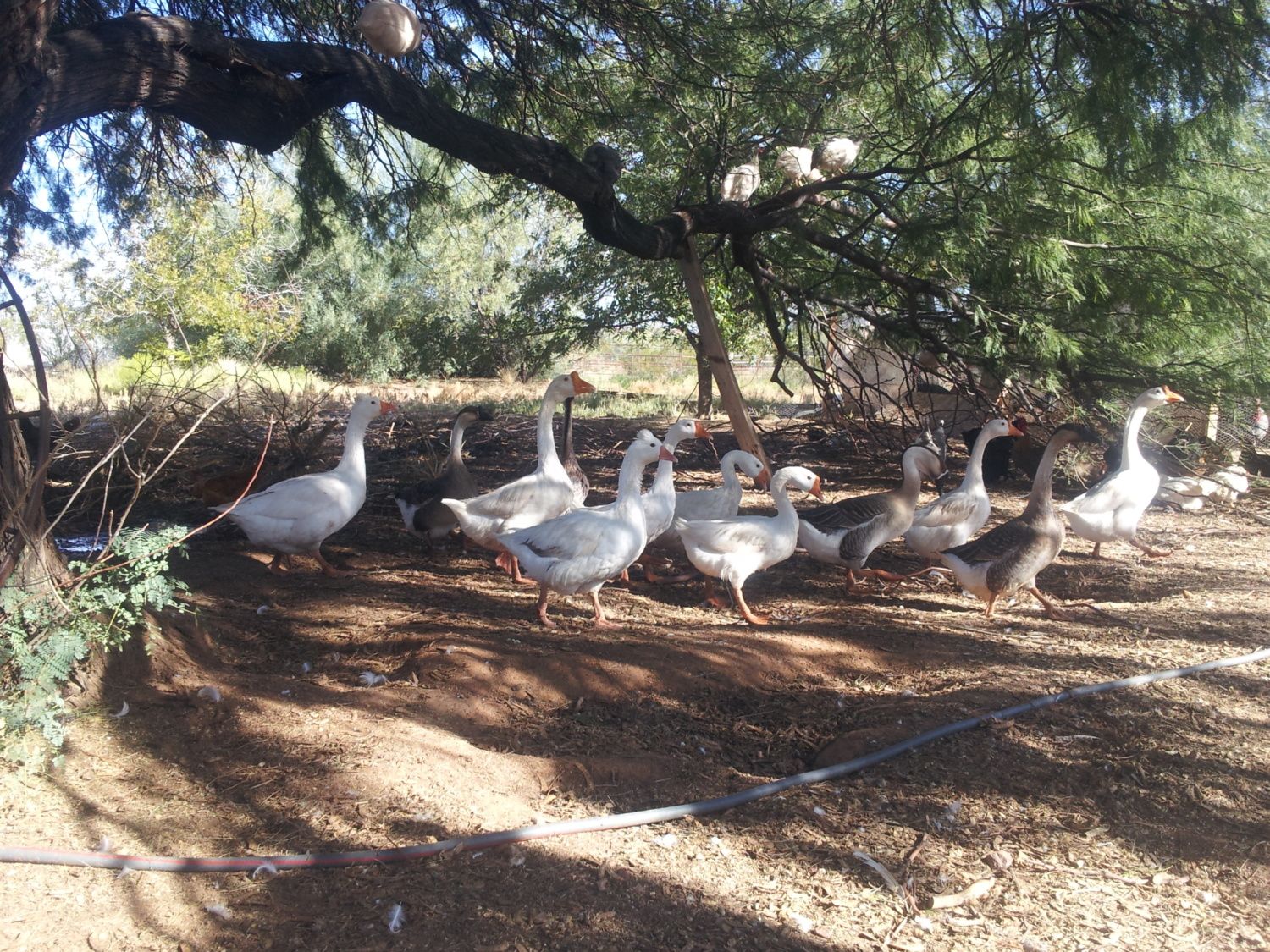 Here is a pic of most of the geese, and a few of the guineas hanging out in the tree