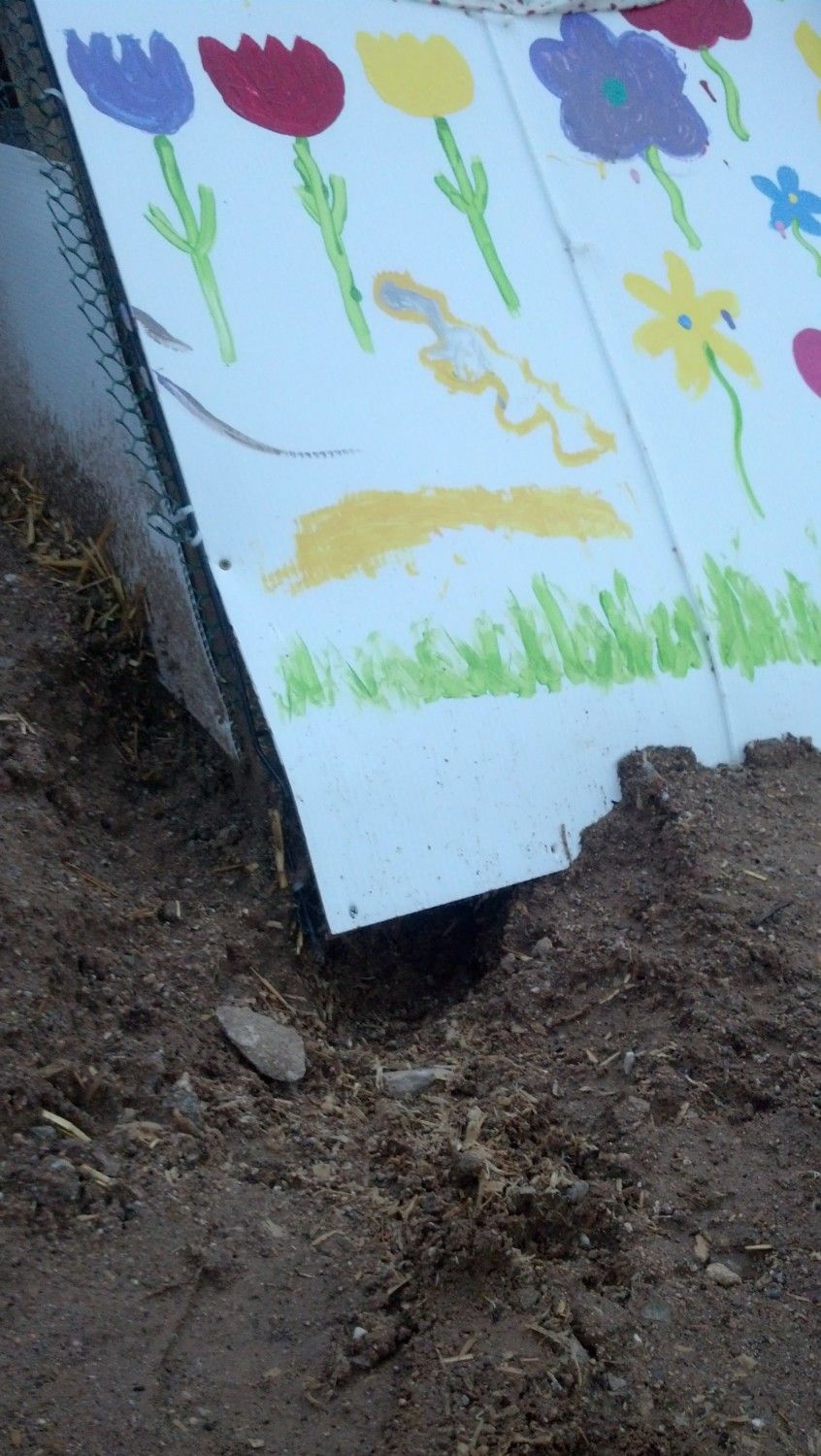 I'll stop talking about my dead chickens, one last post. Whatever it was did use the trellis to get over the fence, there's mud all over the wall. Not one clear print. The **** things totaled my trellis and yet another newly planted rose (I keep trying roses, i obviously need to give up). Inside of the coop looks totally peaceful, not one speck of blood or feathers. The critter gave up a hole in one area and found the weakness just over where the coop was buried 6" down. Oh, and I found fresh quail feathers right next to the hole. Dry, so very fresh since it's only stopped rainingthis aft ernoon.