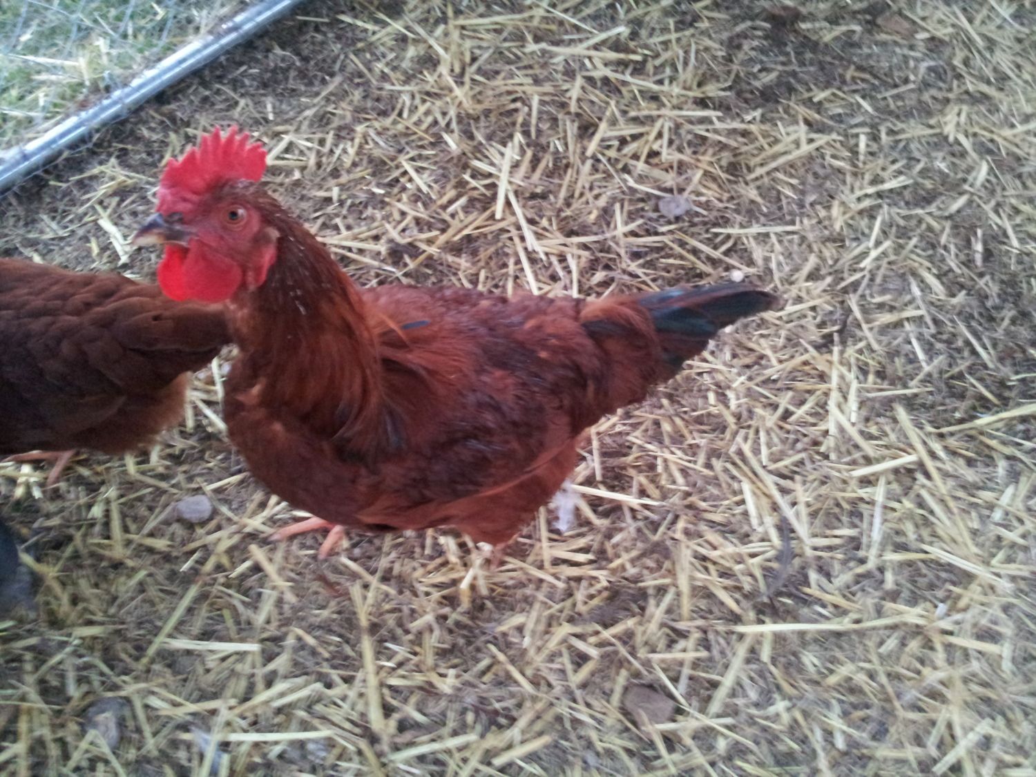 Beauties all of them but that one is a Roo - he's gonna have a super tail too!!OK, I just went out to check on my one laying hen, and I found one of my reds on top of her, holding her down. I was not sure if we had any roosters because they all seemed to be quiet and fairly calm. No crowing at all from any of them. So is this one a rooster if it was pinning her down like that? Here's some pics: