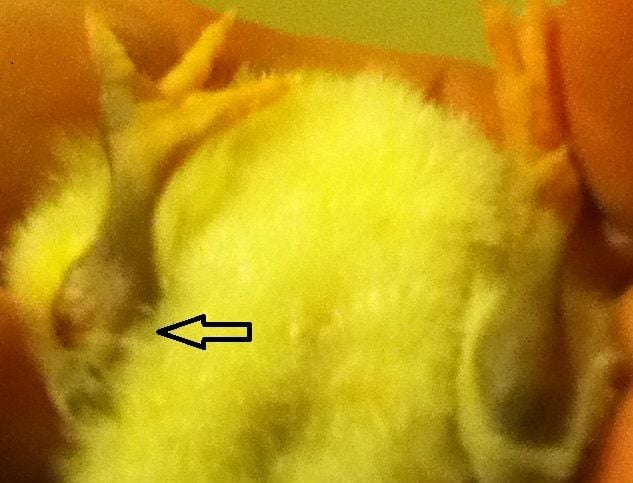 She seemed to be okay. Kind of flopping around as she worked to get her sea legs. She reached a point where she seemed like she was fine. However, by the next day, she couldn't walk. Here are some pics of her legs. Notice at the hock (is it called a hock in chickens?) that the one side is larger and there appears to be a small wound. Is it possible she could have injured herself in the incubator when she was flopping around? This leg she keeps pulled up and doesn't seem to want to put weight on it. Although, I have seen her standing/sitting with both legs under her. Also, the joint seems to flex more in a way that the other doesn't. It kind of tilts inwards.