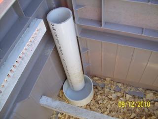 Either way, like I said, it should be easy to do. Rather than having actual "sides" that you can close, it would be cheaper, easy and lighter to use a weather proof barbecue grill cover. For ventilation, you can cut several flaps in it that velcro or zip closed for really bad weather, but roll up to open in good weather, just like a standard tent would. The cover in the photo below even has built in vents on the top and has a chicken-coop shape to it. At $25, it's cheaper than a sheet of plywood, too. There are two quick and easy designs for feed and water. Use a 2 1/2 gallon bucket with a small hole drilled in it for air supply, and then run it down through some pipes to poultry nipples, just like I did in my brooder. That amount of water should easily last a week for your four chickens, would stay clean the entire time and not spill during travels. For the feed, we can build a cheap and easy feed hopper. It fills a 4" pipe from the top and has a bowl at the bottom that only allows a certain amount of food to come out based on how full the bowl is. You control the amount of feed in the bowl by raising or lowering the vertical hopper. If you use a clean-out cap at the top, a standard canning funnel from Ball will fit in the top of the pipe tightly and allow for an easier time filling it. I would assume you could go several days in between fills.