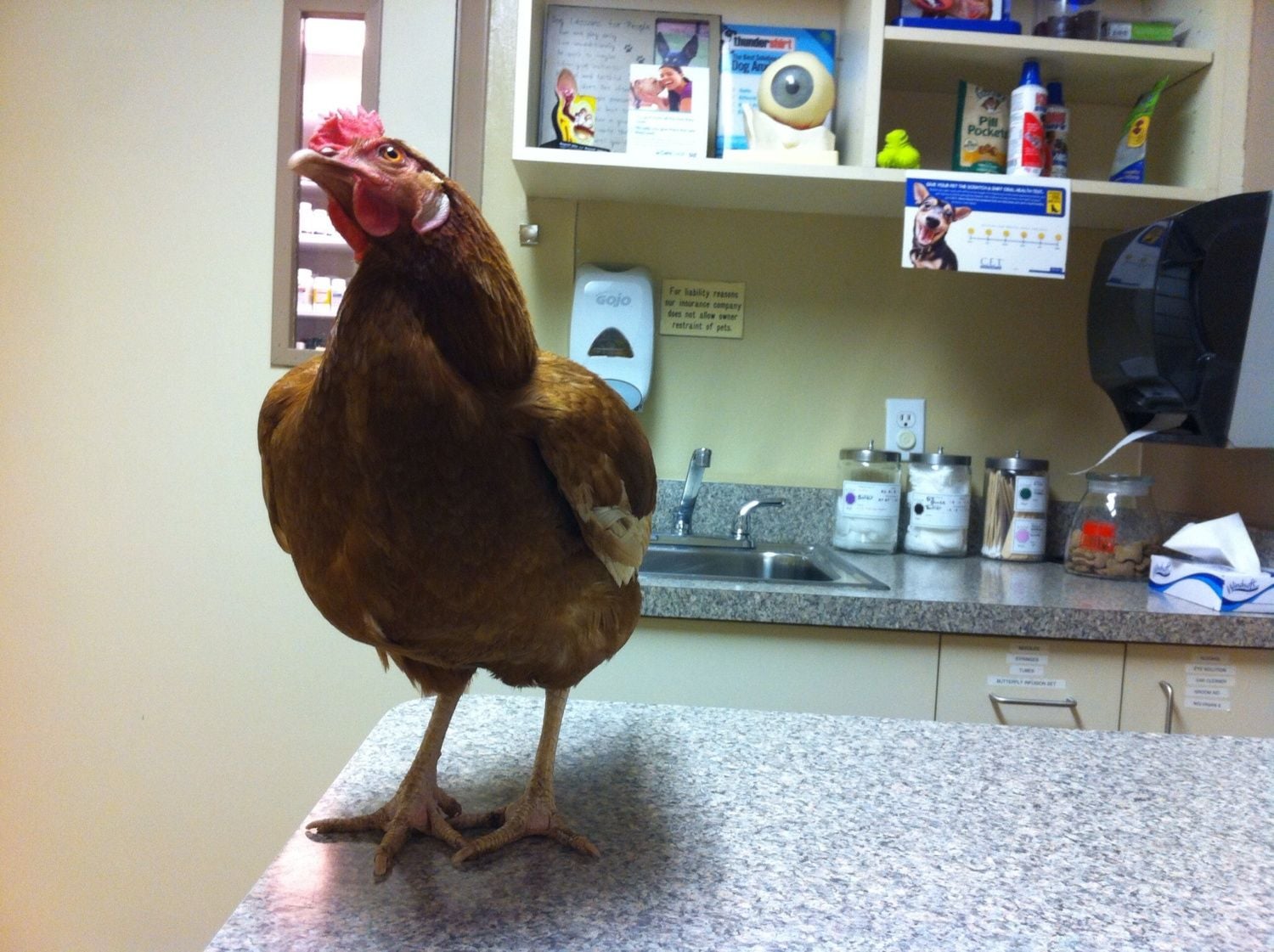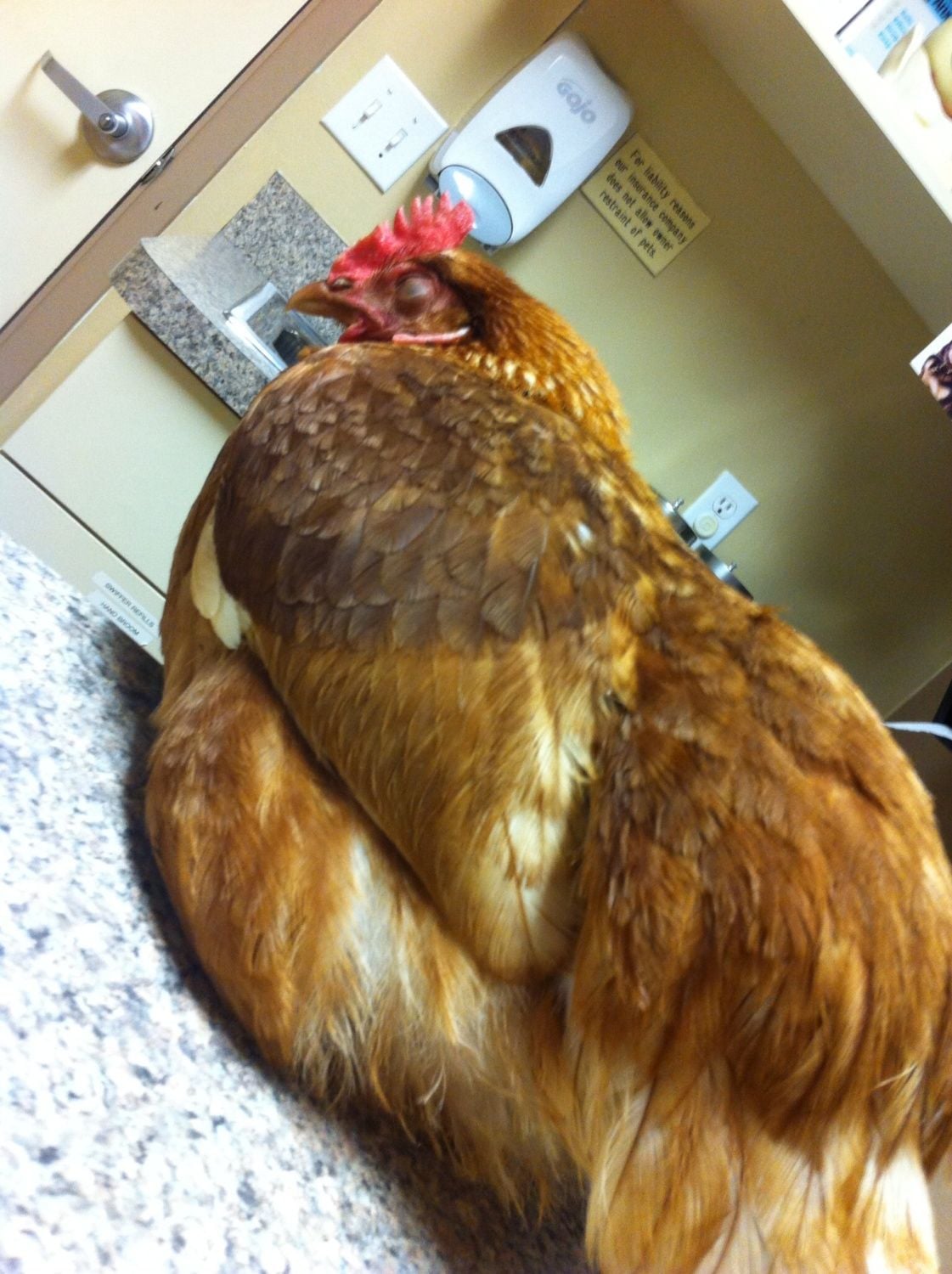 Oh, how stinkin' cute is THAT! Thanks for the photos!So we've had quite the adventure today. I came home yesterday and Our very sweet Boss Hogg had lost her voice. I couldn't find anything helpful on the forums about it. Seems it's happened to a few people but since she wasn't symptomatic in any other way, it was a mystery. I think I went into hyper-chondria this morning because I swore she was walking funny and I got really worried. My friend, who is a nearby vet and also has chickens, said to bring her in and she'd watch her until she could get in with Dr. Funk. She let Boss Hogg hang out in the treatment area and she was very popular there this morning (pecked a cat though). Btw, Dr. Funk is at Mesa VCA and works with a lot of chickens if anyone ever needs a vet. It's on Country Club and 8th.