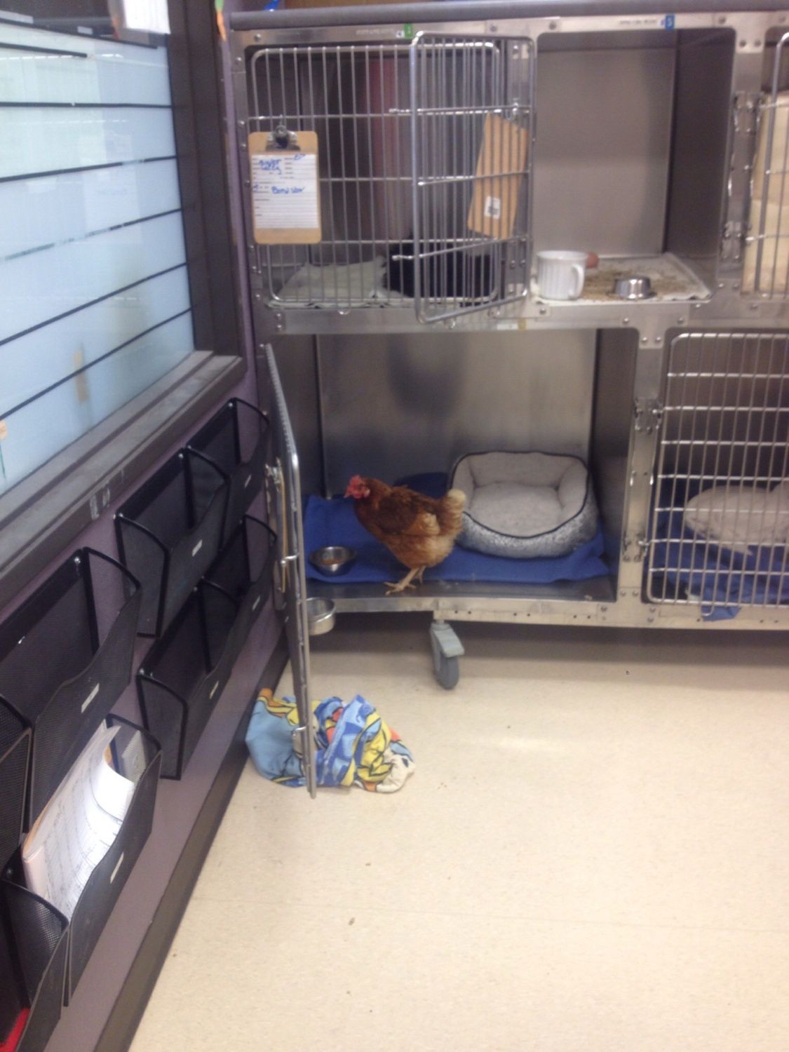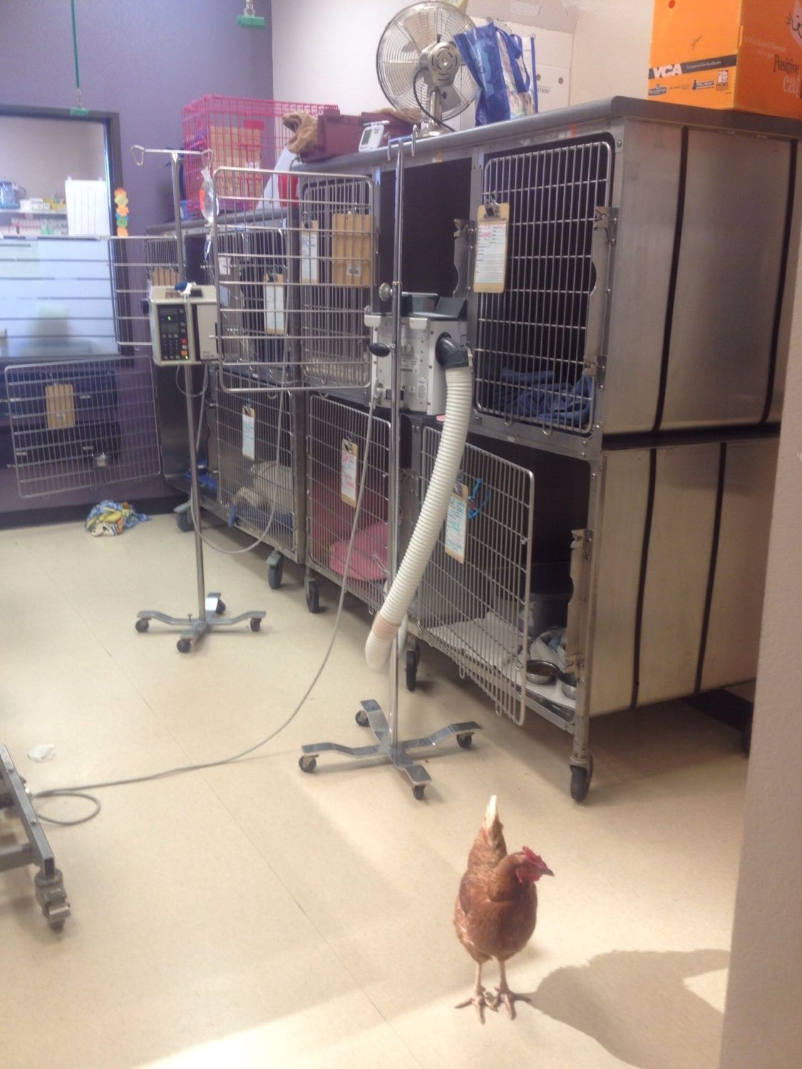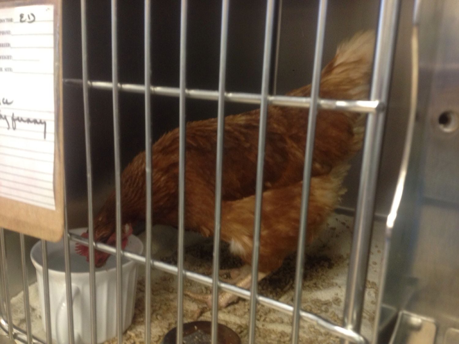 I hope she feels better soon. Birds seem to heal faster than a lot of other creatures.So we've had quite the adventure today. I came home yesterday and Our very sweet Boss Hogg had lost her voice. I couldn't find anything helpful on the forums about it. Seems it's happened to a few people but since she wasn't symptomatic in any other way, it was a mystery. I think I went into hyper-chondria this morning because I swore she was walking funny and I got really worried. My friend, who is a nearby vet and also has chickens, said to bring her in and she'd watch her until she could get in with Dr. Funk. She let Boss Hogg hang out in the treatment area and she was very popular there this morning (pecked a cat though). Btw, Dr. Funk is at Mesa VCA and works with a lot of chickens if anyone ever needs a vet. It's on Country Club and 8th.