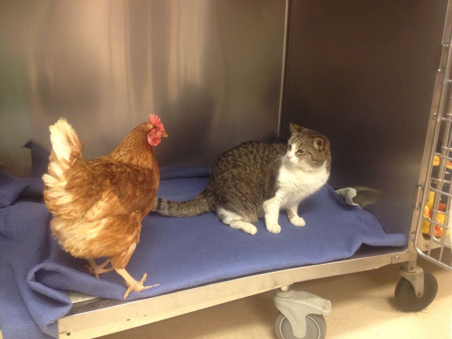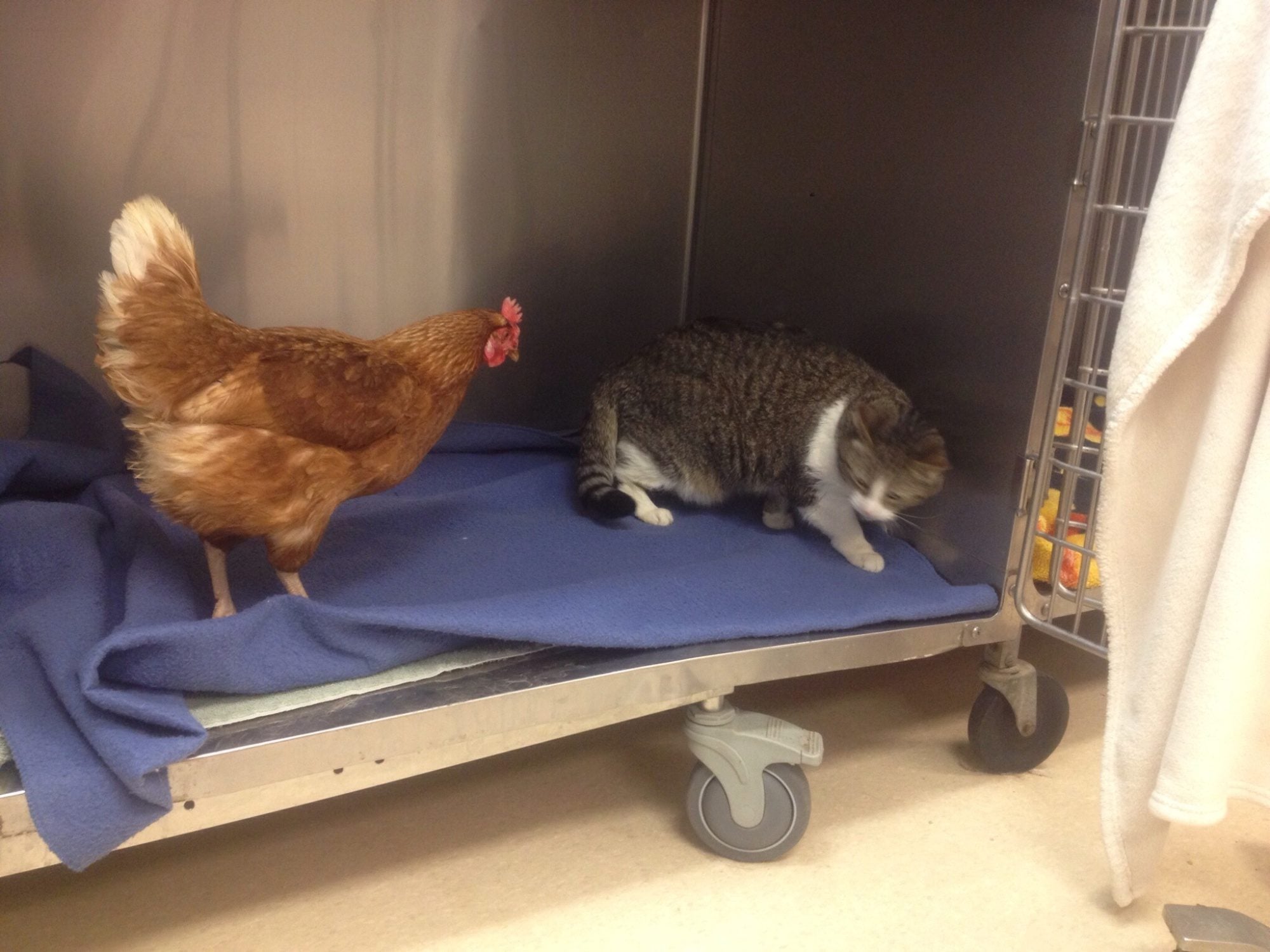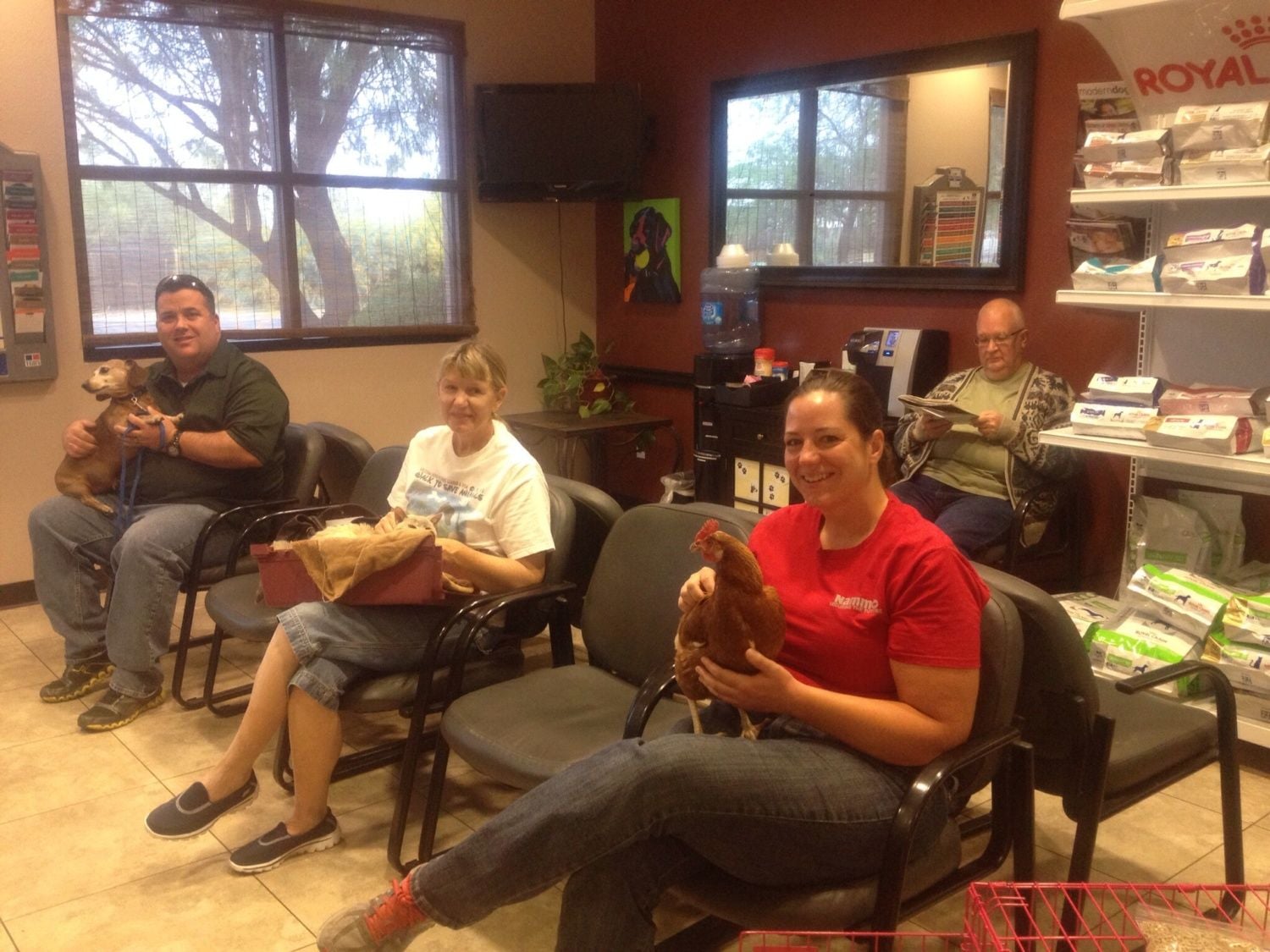 I hope she feels better soon. Birds seem to heal faster than a lot of other creatures.So we've had quite the adventure today. I came home yesterday and Our very sweet Boss Hogg had lost her voice. I couldn't find anything helpful on the forums about it. Seems it's happened to a few people but since she wasn't symptomatic in any other way, it was a mystery. I think I went into hyper-chondria this morning because I swore she was walking funny and I got really worried. My friend, who is a nearby vet and also has chickens, said to bring her in and she'd watch her until she could get in with Dr. Funk. She let Boss Hogg hang out in the treatment area and she was very popular there this morning (pecked a cat though). Btw, Dr. Funk is at Mesa VCA and works with a lot of chickens if anyone ever needs a vet. It's on Country Club and 8th.