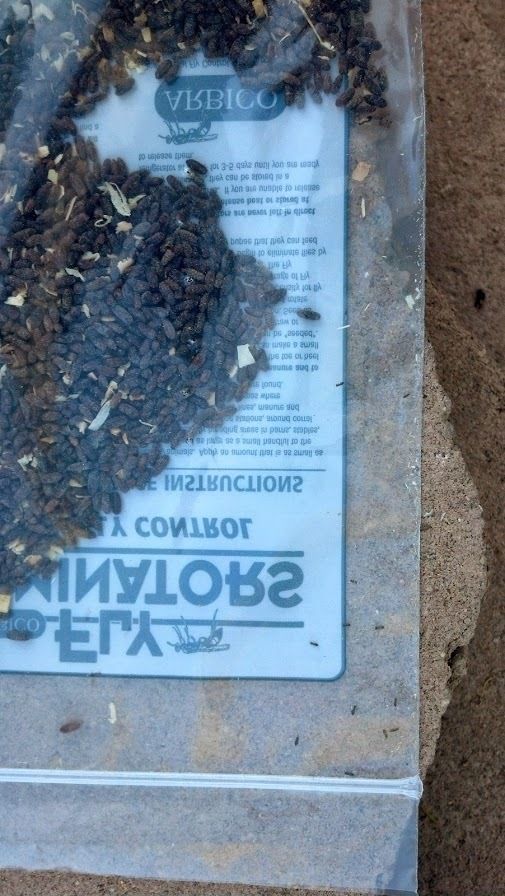 I checked my second bag of fly predator this morning. Looks like enough have hatched that they are ready to spread tonight. For those that are curious, I took some pictures of the pupae and the wasps. The wasps are tiny. Sorry, there is no scale from which to judge...but the pupae are about the size of a shortish packrat turd. The wasps that hatch out of them seem much smaller that the should from the size of their pupating form. Those black specks in the bottom corner of the bag are the wasps.
