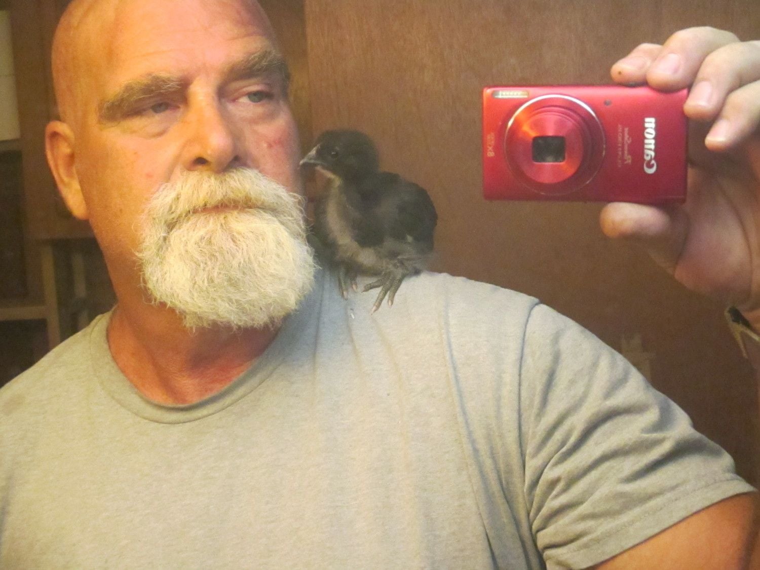 You're right, I sure don't trust him now! With that said, let me introduce Jenny (aka The Lone Survivor) to you all. Over the last few days she has become quite attached to me. I'm her alpha roo....When I approach the brooder, she comes over, cocks her head to eyeball me, and waits for me to pick her up. The new brooder is too tall for her to fly out, so she has to wait... This is Jenny. She likes to sit on my shoulder and preen my beard and eyebrows. She frequently craps on me too, but I'm ignoring that. She's had a rough week. This is Jenny playing nice with her new friends (3 Buff Orpingtons and a Barred Rock). I tried to get a pic of them all sleeping in a ball, but they always hear me coming. I had already forgotten the "face plant" sleeping method of the baby chicks.