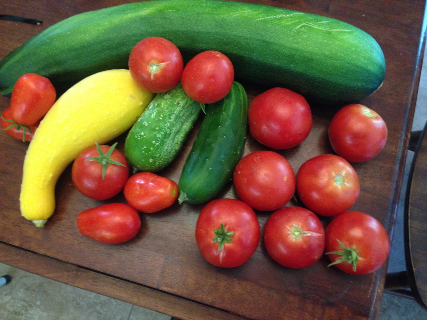 Today's veggie harvest. I apparently missed a zucchini last week which grew into this 18" monster. It's a shame because it's my only one this week and they never taste as good when they get too big. I'll find something to do with it. Maybe if I process it with some water It'll make a decent bread. No eggs yet today. Eleanor is broody and the other girls are busy trying to stay cool.