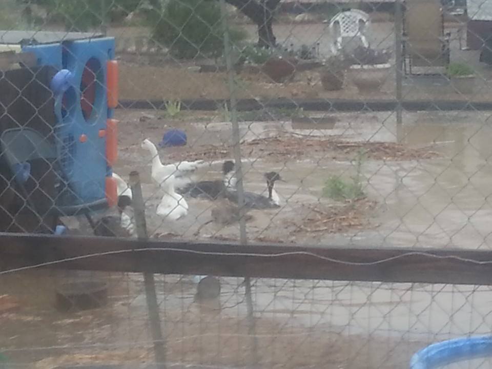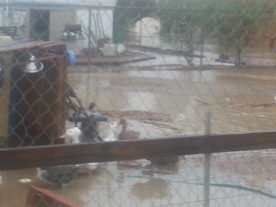That is a lot of rain there... @littlechicken your ducks are beautiful.. Has anyone heard that one large rain drop in the chickens nostril can drown them??I took a load to my new place in Avra Valley, then was heading into town to get some feed at OK Feeds. Took Avra Valley Rd across to Silver bell and headed south, just north of Cortaro Rd my clutch decided its useful life was done. Tow truck to my Marana house was $67, unloading my truck into the driveway was lots of fun in the rain! Got a new clutch kit off eBay for $135, but it won't deliver 'til Monday, so I'm charging the battery on the Harley as we speak. My chicken run was flooded, but since it wasn't coming down on their heads, the chickens seemed to like it.