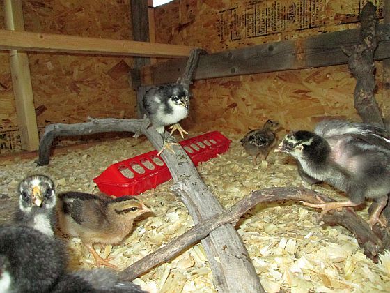When I have a broody with chicks in the flock, I make a creep feeder by using a cage that the chicks can get through the holes but the big chickens cannot get their heads through. I put chick feed and a chick waterer in there. Right now I have little Silkies in my Silkie pen and I am using an upside down milk crate as a creep feeder. They go in through the handle holes.