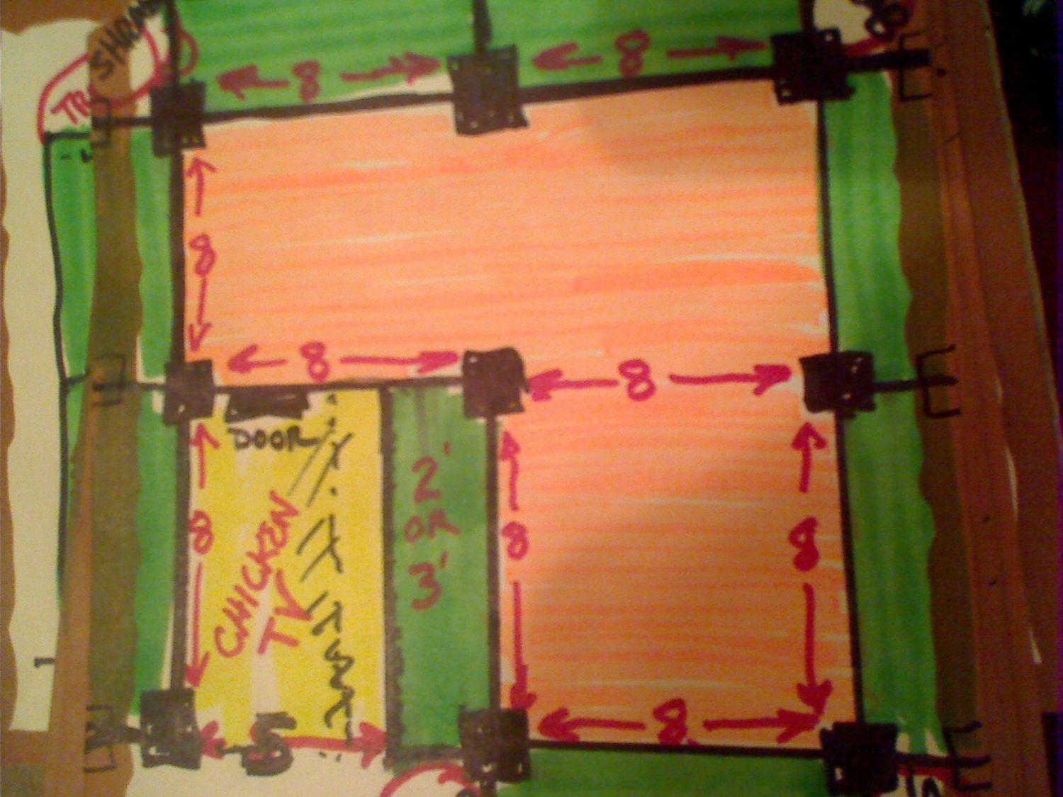 Basically, this whole thing is an L-shaped 16x16, with that small 8x8 Chicken TV area on the outside. It's whole structure is gonna be alittle bit larger since I will be using 4-inch blocks (those black squares) and joists to connect all the wood.