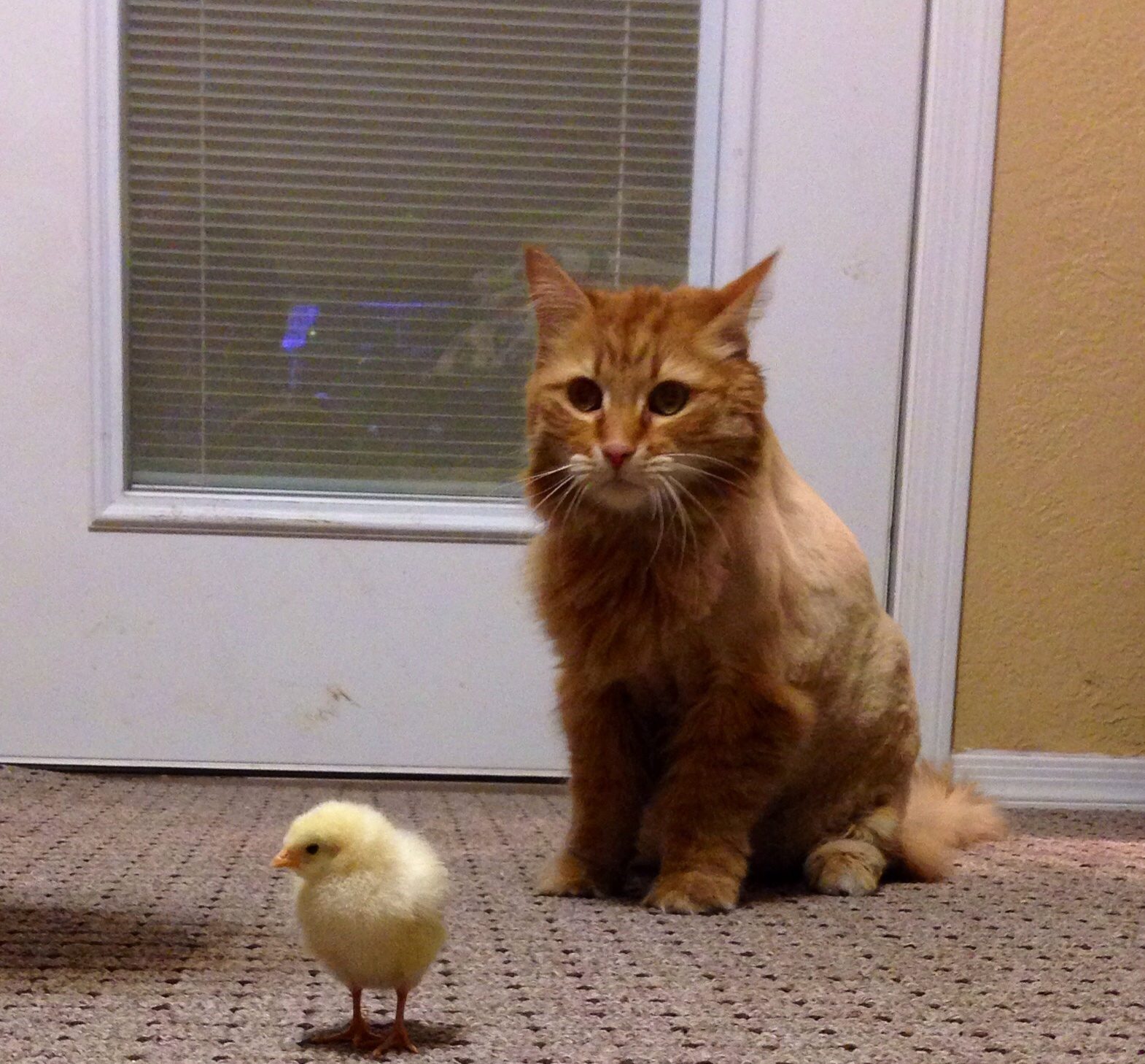 I won't let him near the new babies until they get bigger than him, but he hangs out with our year old chickens all the time. They take his food right out of his mouth and he just lets them. It's funny...