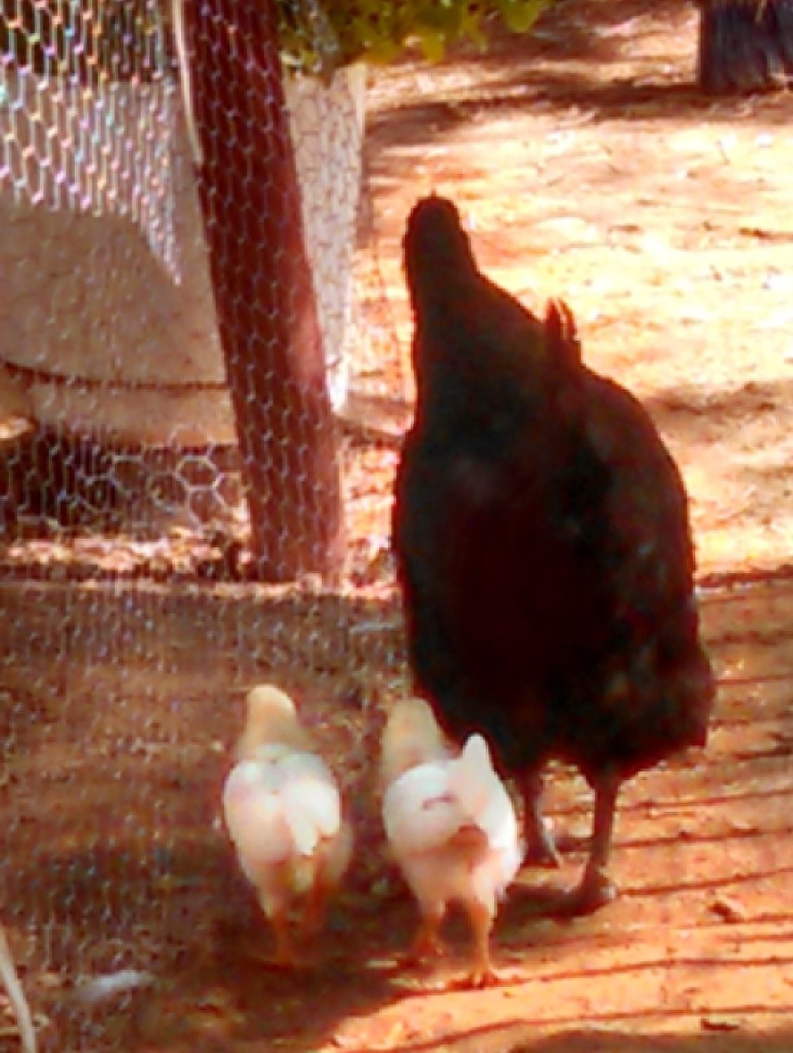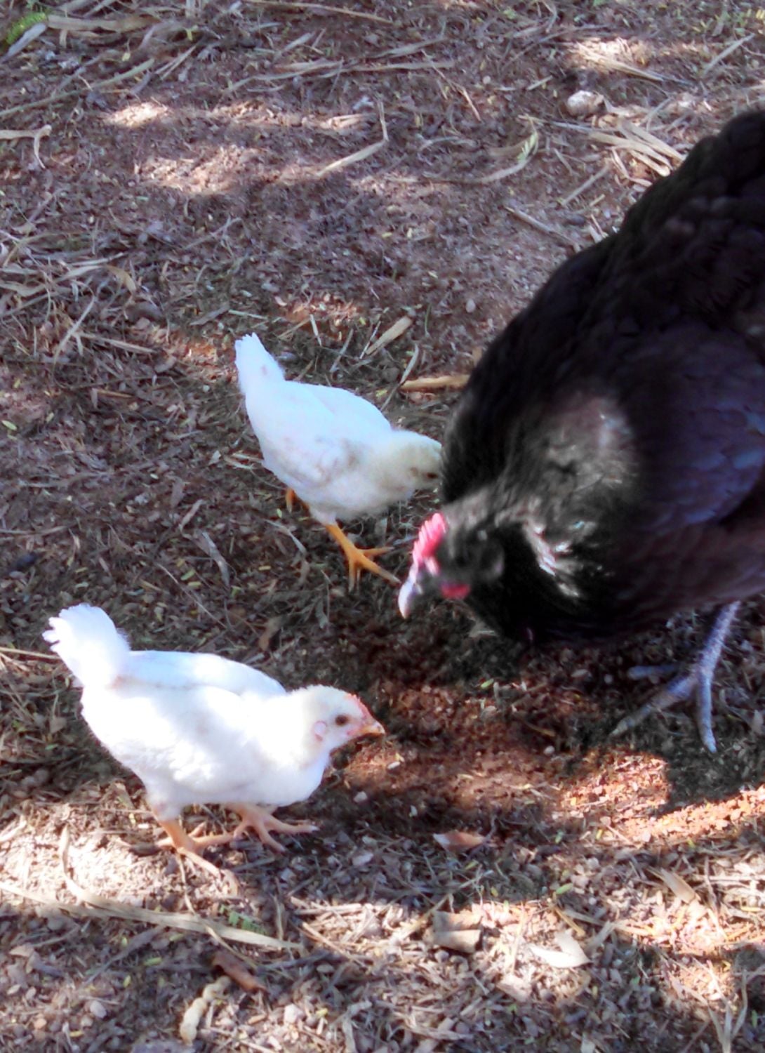 That last picture looks like a calendar shot. So cute.Okay momma told me it was time for the little ones to learn about their bigger world. They are three weeks old now. She took them all over the pasture, the run and the coop! Plus they had a little lesson on scratching up those bugs! The littles are full of p&v - I'm thinking I have one roo and one pullet. The one I think is a roo has a black mark on one wing- much like grease on my DH hands - so we call him Greasy. It'll still be Greasy should he really be a she!! So its time to change to a different feed - I don't need the littles getting into the layer! My girls don't like pellets and I'm only finding pellets for flock feed. They also don't like fermented feed. I could use a starter/grower for them. I was wondering about a meat bird feed. Higher protein would be good for the molt but I do have girls who are a year or less but laying. I'll put the oyster shell up a little higher - but its available to them all the time. Thoughts from the experts?![]()