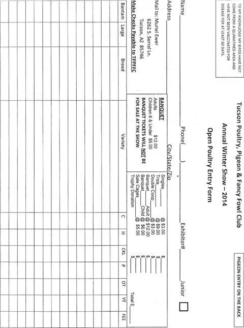 The exhibitor number gets assigned after you submit the application. Birds in the show are labeled with exhibitor number, not the owner's name. There will be a list of exhibitors at the front desk when the show starts. Be sure to grab one early because they often run out. When you see a bird you like in the show and you want to know who it belongs to, find the exhibitor number on the coop tag and look up the exhibitor on that list. Showing by number helps prevent the judges from being influenced by the name of the exhibitor.
