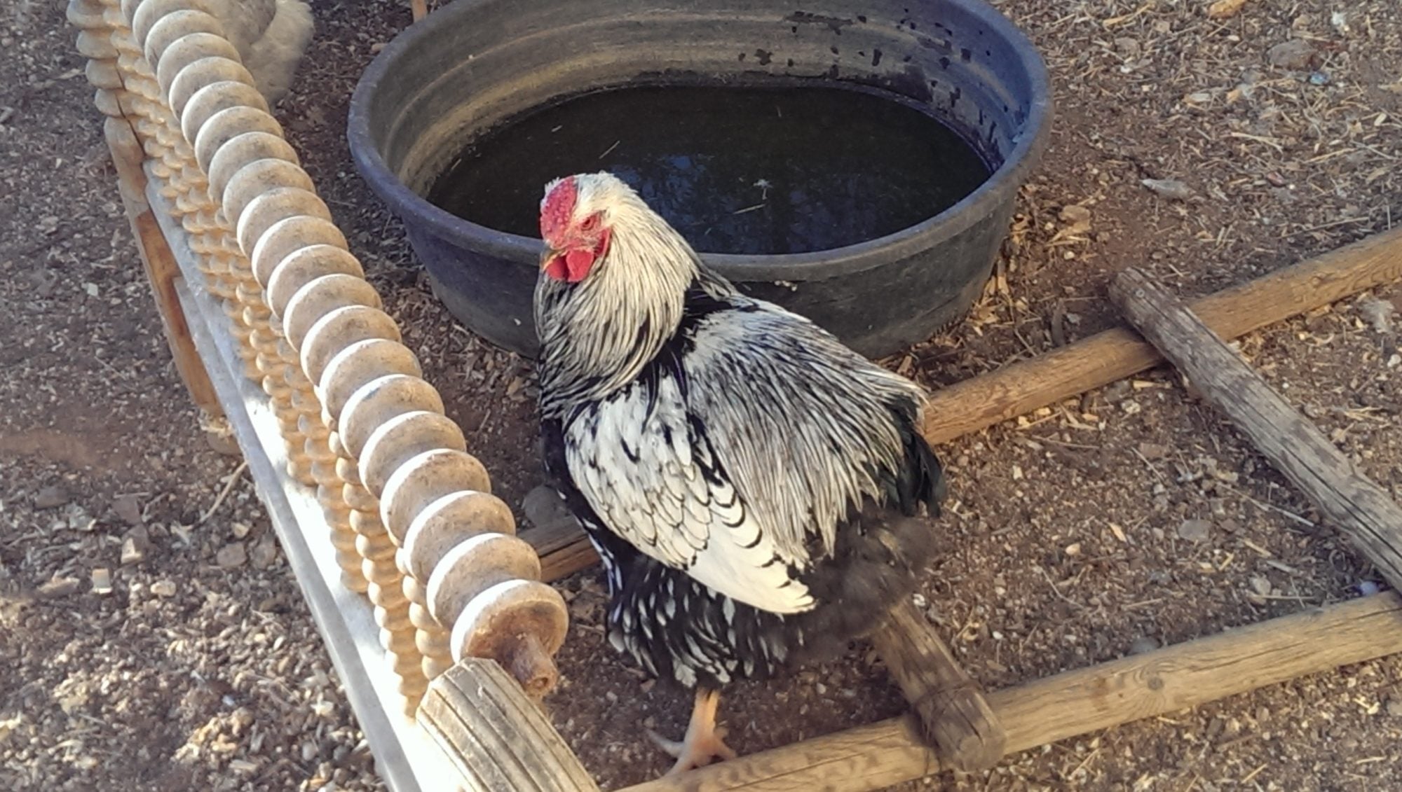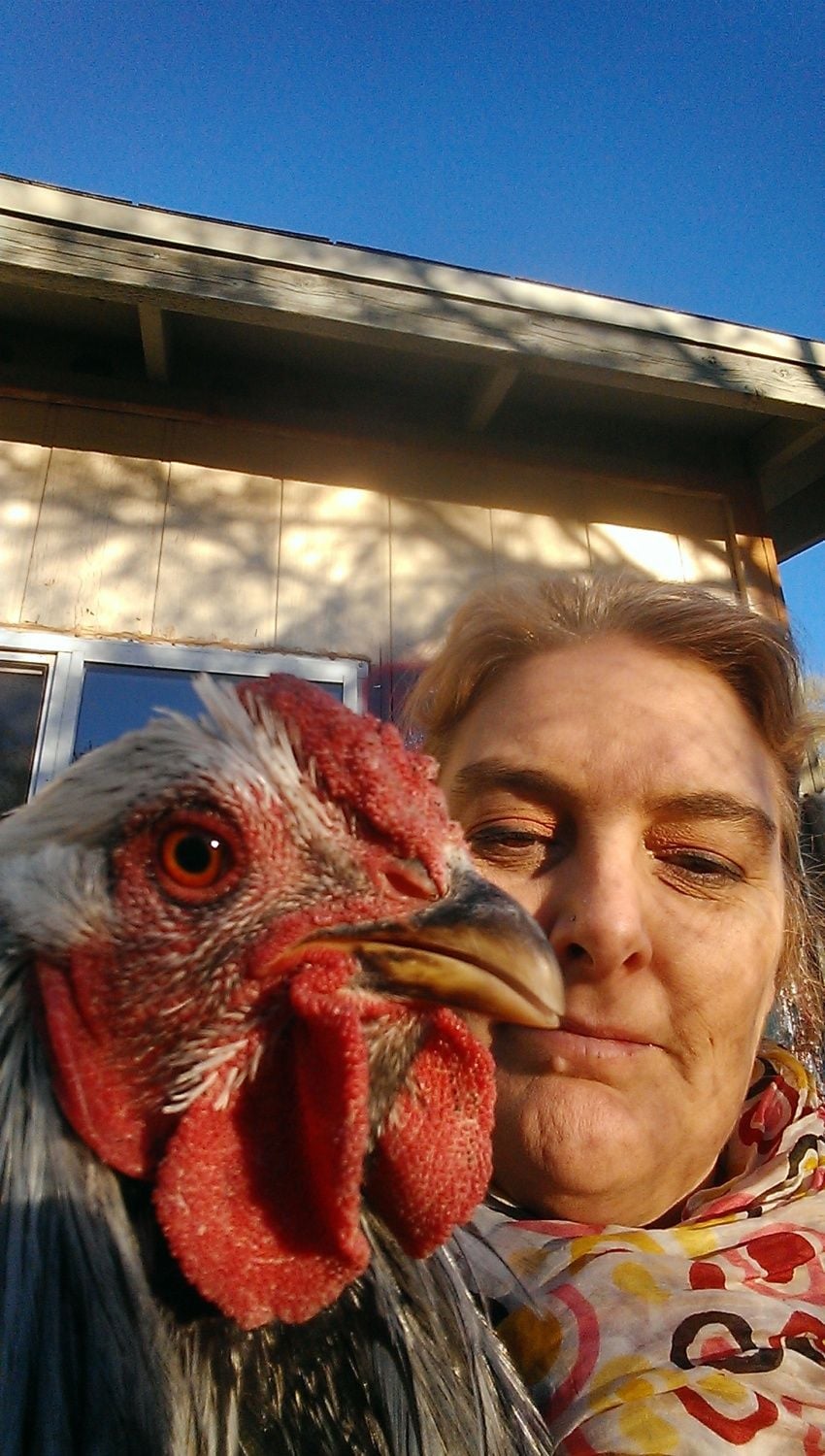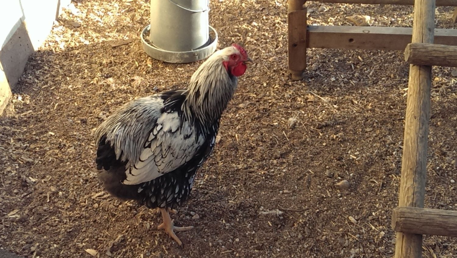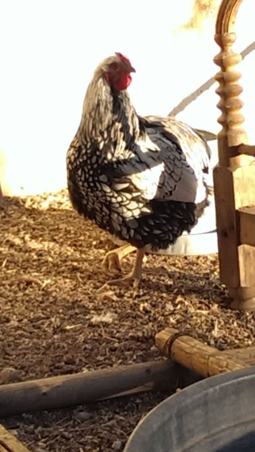 I don't think I my new Wyandotte hens could fit their fluffy butts in any of those nooks! Would anyone be interested in a this Wyandotte roo? I bought two pairs at the poultry show and really only need one roo. They are in the same pen and don't fight at all. George is quite submissive to Jack-Jack, the head honcho. They were both show birds and had been handled a lot. They were bred by the gentleman from New Mexico whose white call duck got Reserve for show (I think). I also got a pair of black Bantam Wyandottes who are adorable and very handleable. I'd be open to letting them go, too, as I'm not breeding for show. Someone else might get more rewards out them than I would. I don't have pics of them right now, but they are shiny, puffy, and round with black iridescent feathers. @AZChiknGoddess handled them and could tell you more about those little ones if you were interested. Here is Georgie. He looks small because of the perspective of the camera, but he is quite huge! Not a hatchery bird! His tail feathers are growing in. If you are really into breeding and showing I'd be happy to let you compare the two, Jack-Jack and Georgie Porgie, and take your pick. Hoping to get $20.