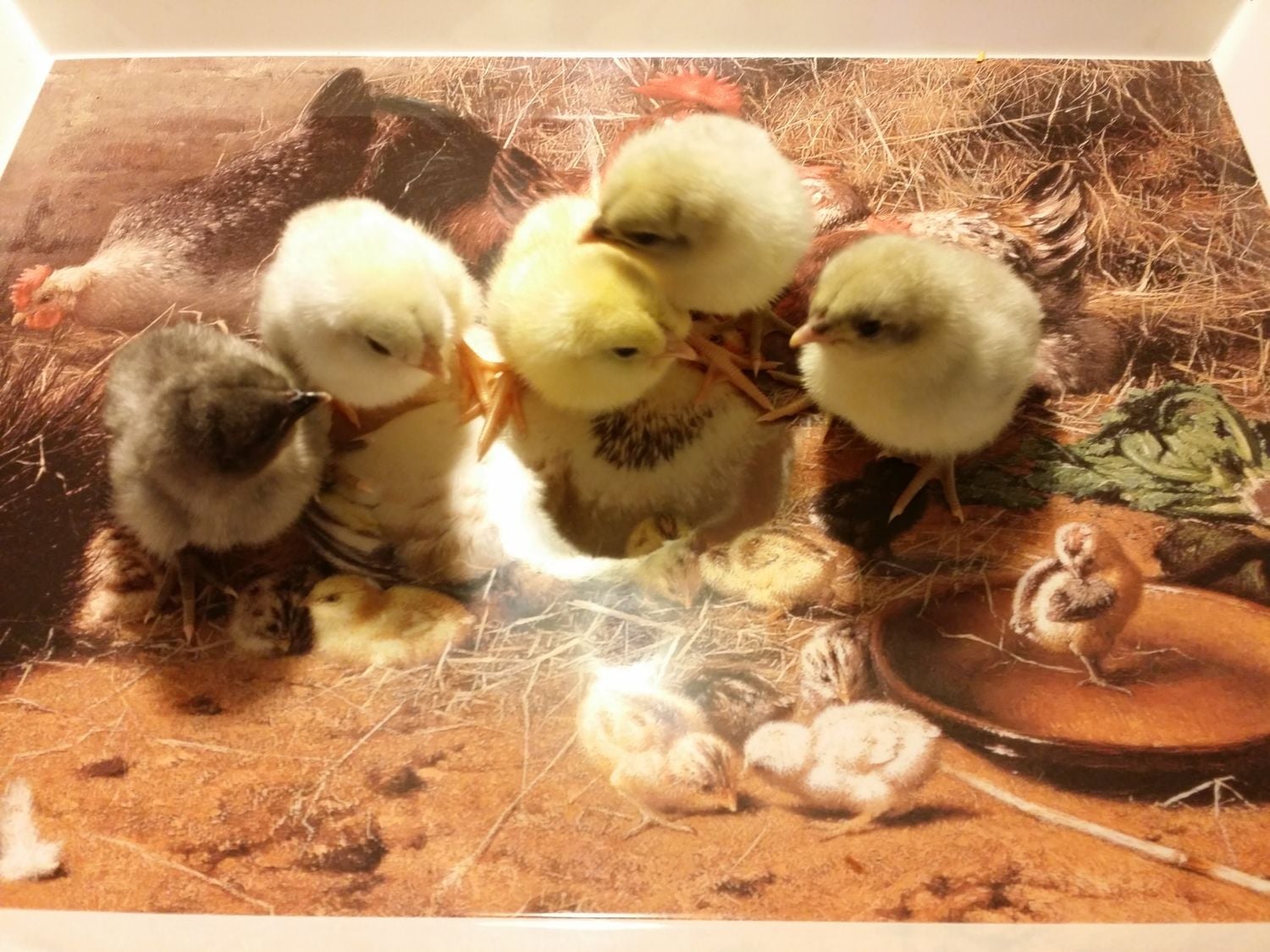 Chicks on a mat with pictures of chicks...LOL! They almost blend in with the picture. Very cute! What breed?