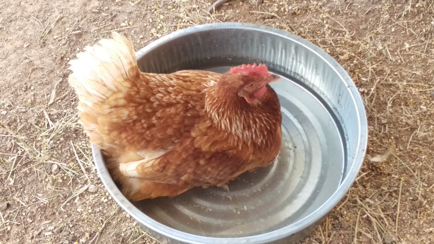 cute picture! !!!Don't the pans get hot? It seems metal would get really warm. I just use the WalMart oil drain pans - $1.98 I think these days but they work just fine for standing in and its a riot to watch a girlie finish laying her egg and run for one of the pans, steps in and drinks at the same time. Hopefully someone will chime in with where they get their fodder seed - wheat or barley, whatever. My girls are really craving greens again - I think its a molting kind of thing!!