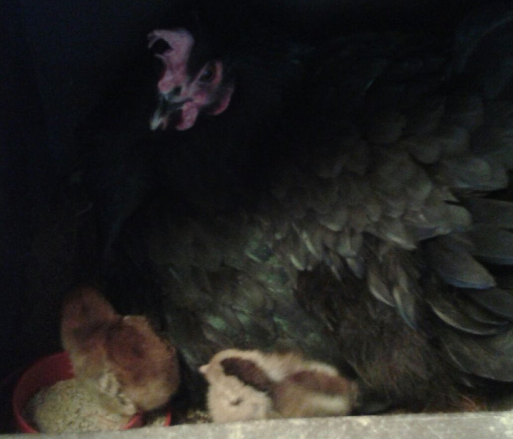 It's been a while since I've posted, I need to catch up reading later. A couple of my hens have been broody, one of them is on her third broody spell! She's half naked because she plucked everything on her chest and belly to keep her imaginary eggs warm. So when my sister gave me some chicks as an early birthday gift I put them under the semi bald broody after full dark. She started clucking at them immediately. By morning it was obvious she had fully adopted the little fuzz butts! They are cherry eggers and brown leg horns.