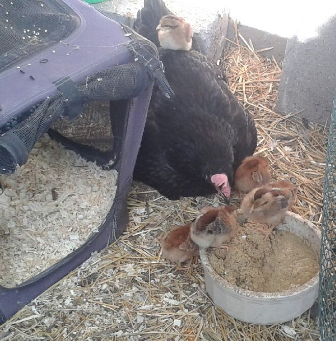 And out in the real world. The glop in the dish is fermented feed. They are penned off from the other hens, momma is very protective and wouldn't relax until I put them by themselves. Evidently being on mom's back is great fun because there is usually one or more perched on top of her.