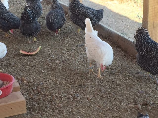 The Leghorn in the first image has a black spot on her tail. The 2d image look at the Leghorn on the left in front of the red pan.