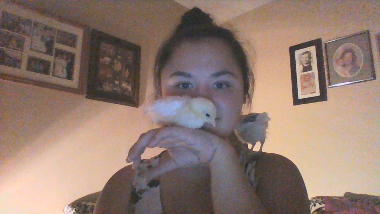Mom has finally come to terms with the baby chickens. my grandma, who bought the chicks, brought their new coop by today for me to set up this weekend for them. it is meant to hold 4 chickens so I might persuade my parents with good grades and lots of dishes to get these girls some friends (silkies or polish from the ACE on 22nd im hoping...) they will move in when they have their big girl feathers. Their names are August (Auggie) and Rosemary (Rosie May, Rosie, Rose) they are california whites so ive come to find. I was doign a gender ID search. they are loooking pretty girly....for the moment.... anyway have some AWFUL pictures of me and my babies. August in on my shoulder, and Rosie May is in my hand. they are huge cuddlers.