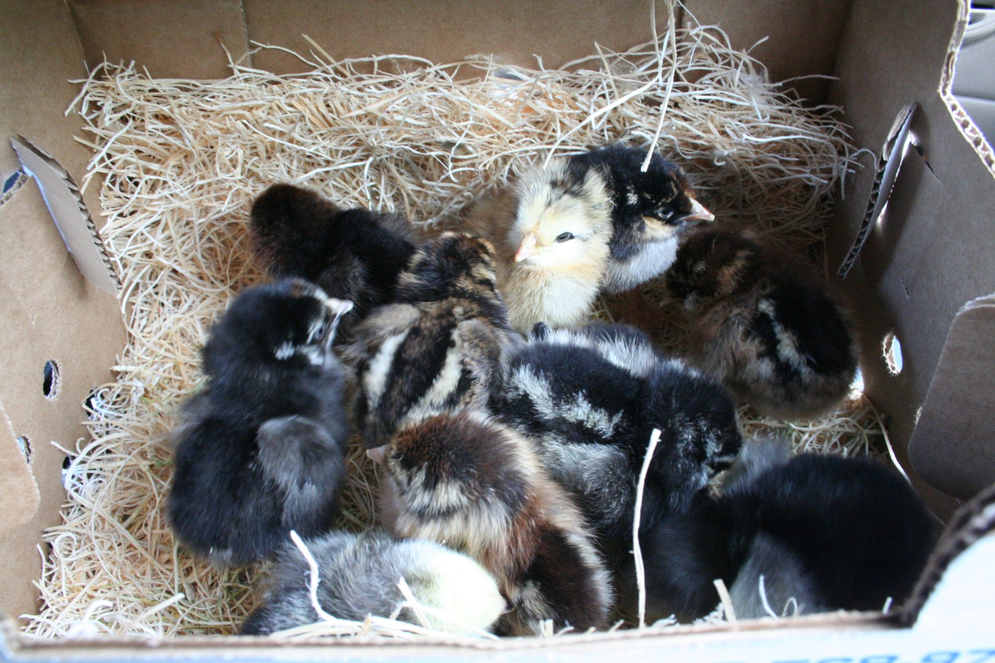 baby picture! this is them still in the box. Have them in the brooder and they all look great though I think we'll need to expand the size of the brooder immediately.
