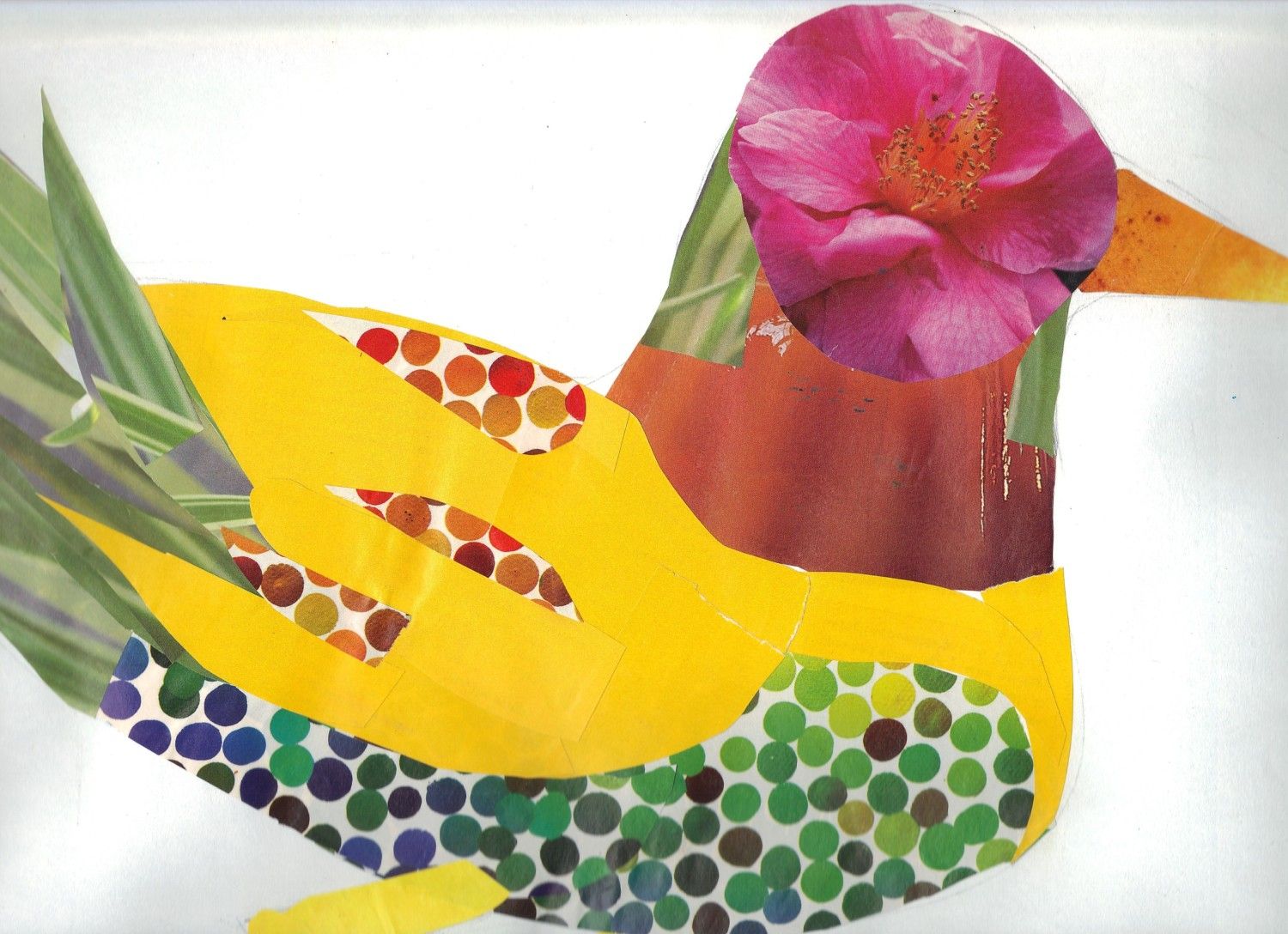 I made this out of photos cut from magazines. I used a flower for the head, jelly for the neck, and leaves for the tail. I had a Mallard duck in mind, but obviously I didn't use the right colours lol. There's too much of it to fit in one photo.