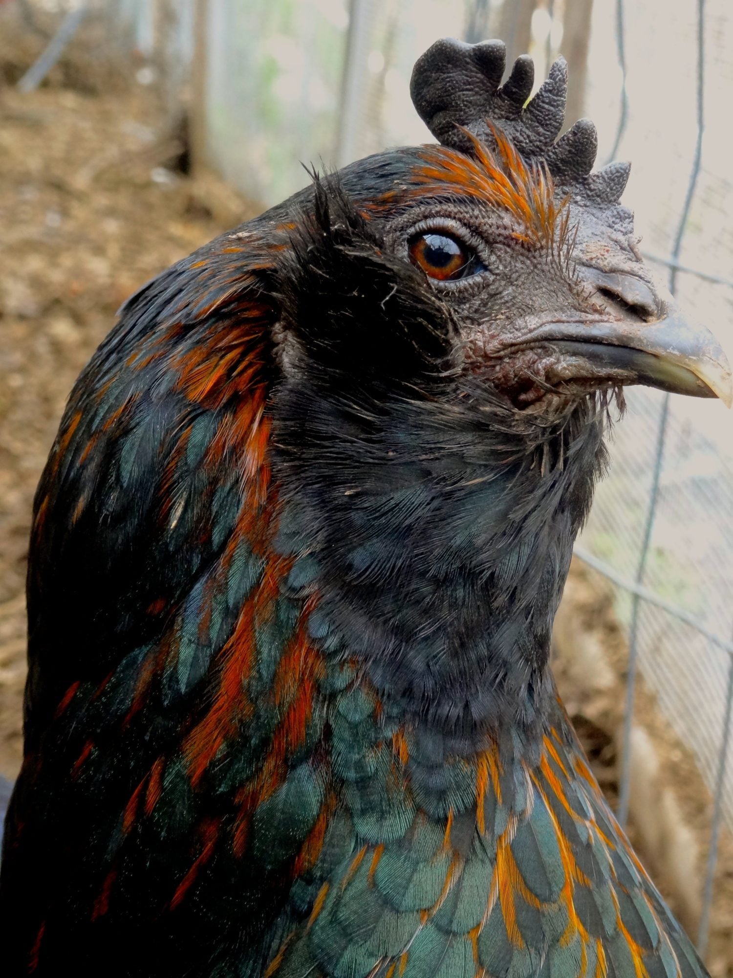 She's a designer breed.A Silkie/Black sex-link cross. She has the black skin, beard and slight foot feathering of the Silkie, but the heavy body, coloring and laying ability of the sex-link. I'm hoping to create more like her.