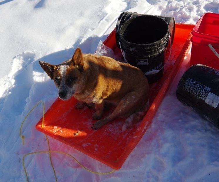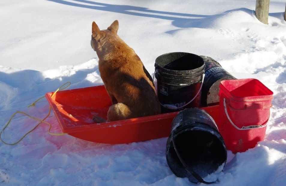 The dogs cope well at adapting...helping me with chores but taking advantage of things like an empty (well OK, room enough for ONE dog) sled to sit and wait for me to finish up without getting COLD TOES!