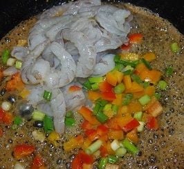 then add some honey, saute the bell peppers, green onions and raw shrimp