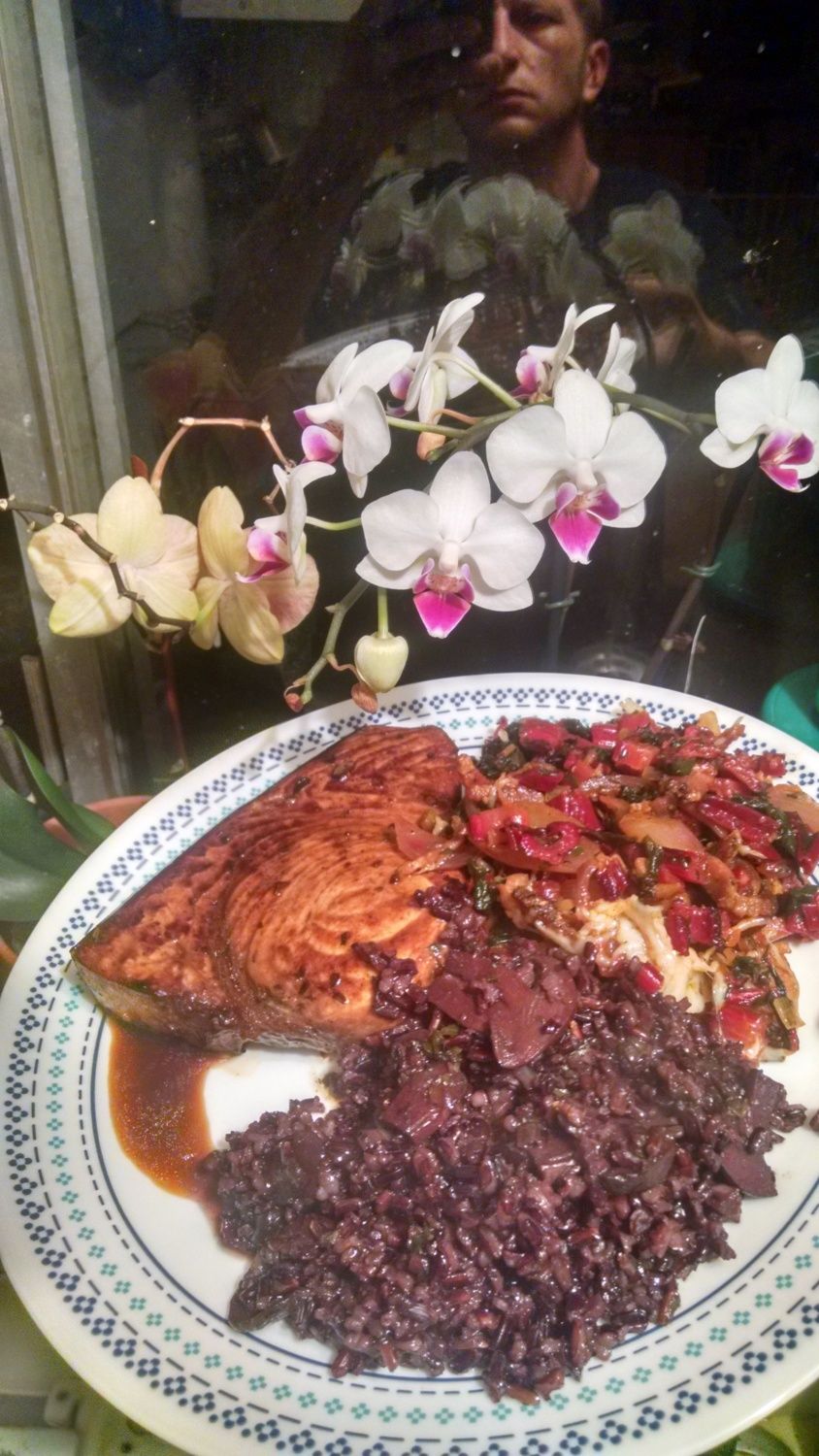 Finished product. Panseared sword fish, sauted swiss chard with bacon and red onion. Black rice with mushroom leek garlic and white onion. Fresh herbs in everything, basil parsley marjoram tarragon. Salt and pepper to taste. Fres shredded parmesan on the chard.