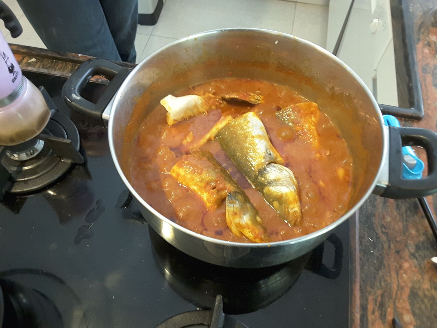 Hariimi - see fish in a spicy Libyan tomato sauce for lunch with my son.and yes THE HEAD IS THE BEST PART!