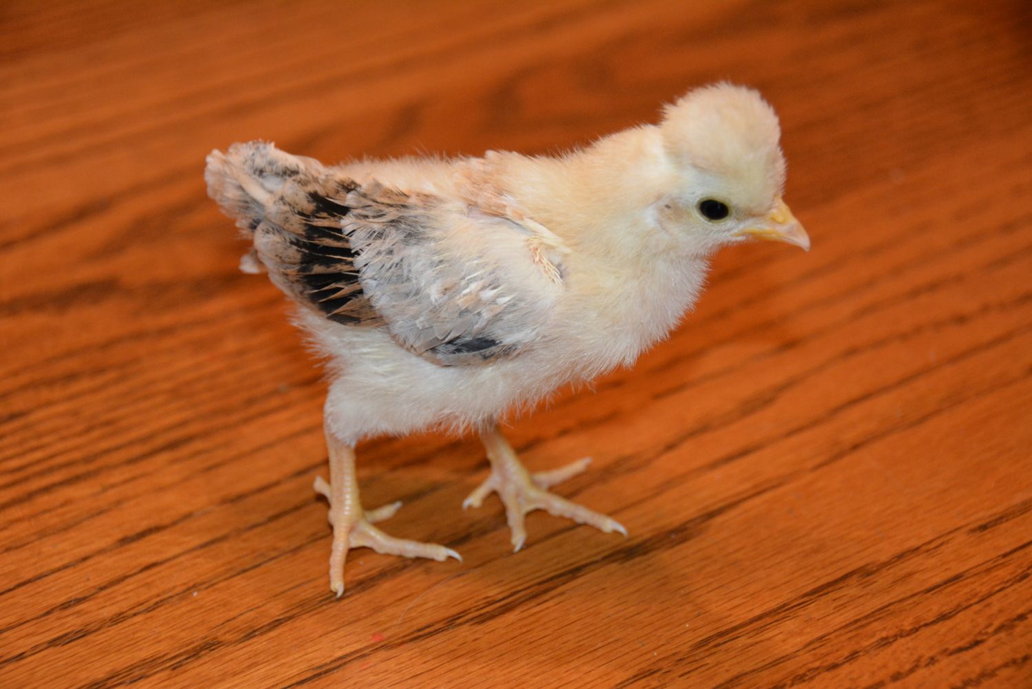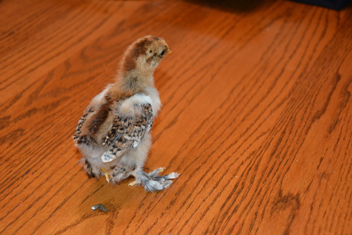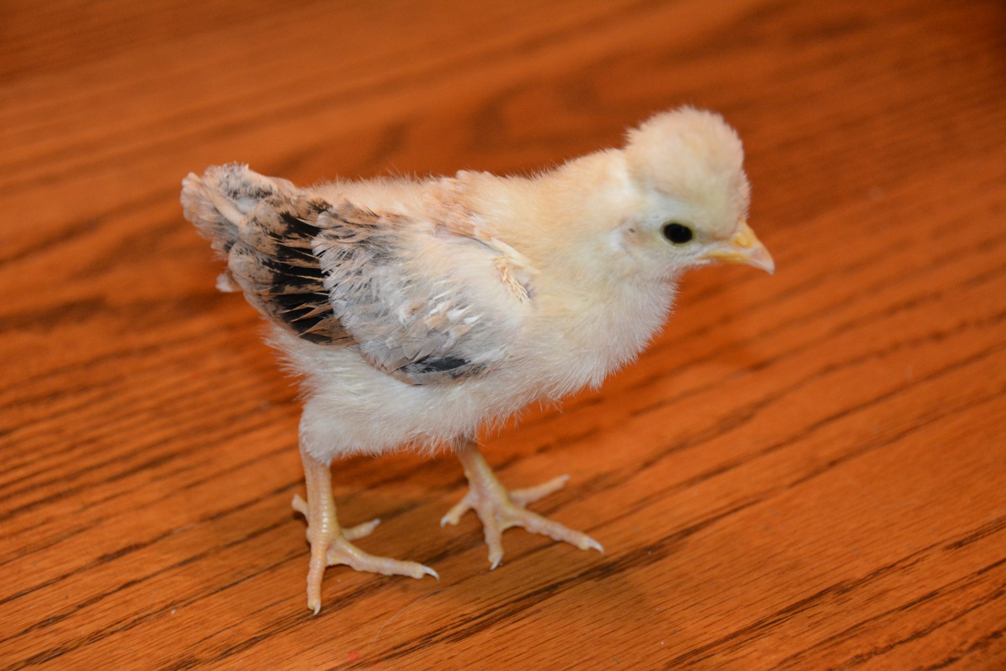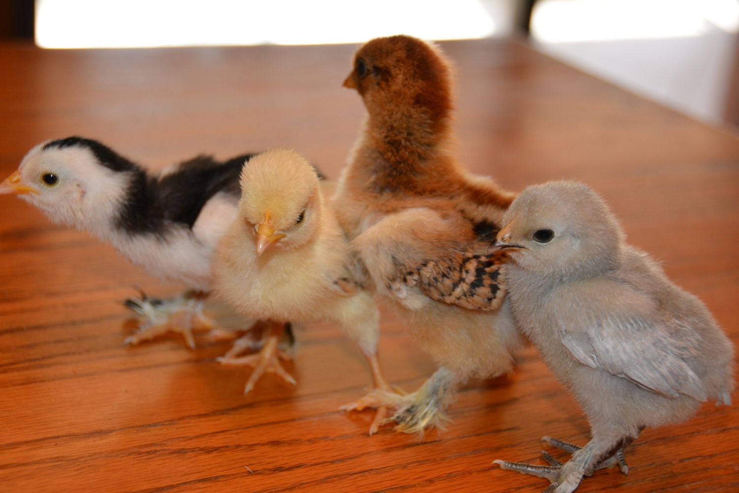 We've got 4 new chicks from an assorted bantam run. Can anyone help identify the breeds? All have feathered legs/feet except for the yellow one. Thank you in advance!