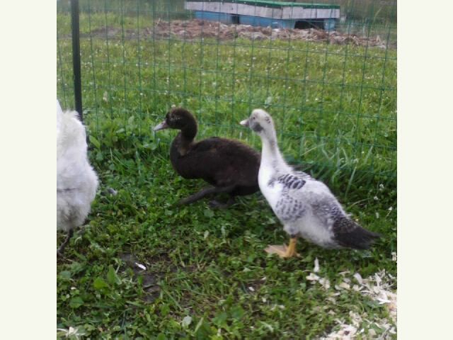 This is when I first got them, now, the black one(Thunder) is 3x bigger than the white one (Lightening) and has the red stuff on his nose and is jumping on the backs of her and my 2 campbell's. lol First time with a couple so not sure what to expect, when or how to prepare. The ducks have a pen they go into at night (finally) and then spend the day out in the pond, I know when I got them I kept them penned till their flight feathers came in, I heard they can't go in water right away. So if they have ducklings, do you have to pen them or does mama keep them away from water?