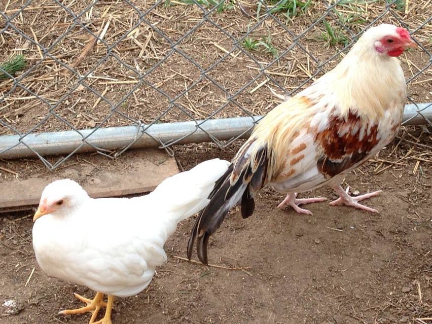 The yoko pullet is the one onthe left on the black wall. The other white ones are white jap bants, and the one on the shelf is a bantam salmon faverolles.