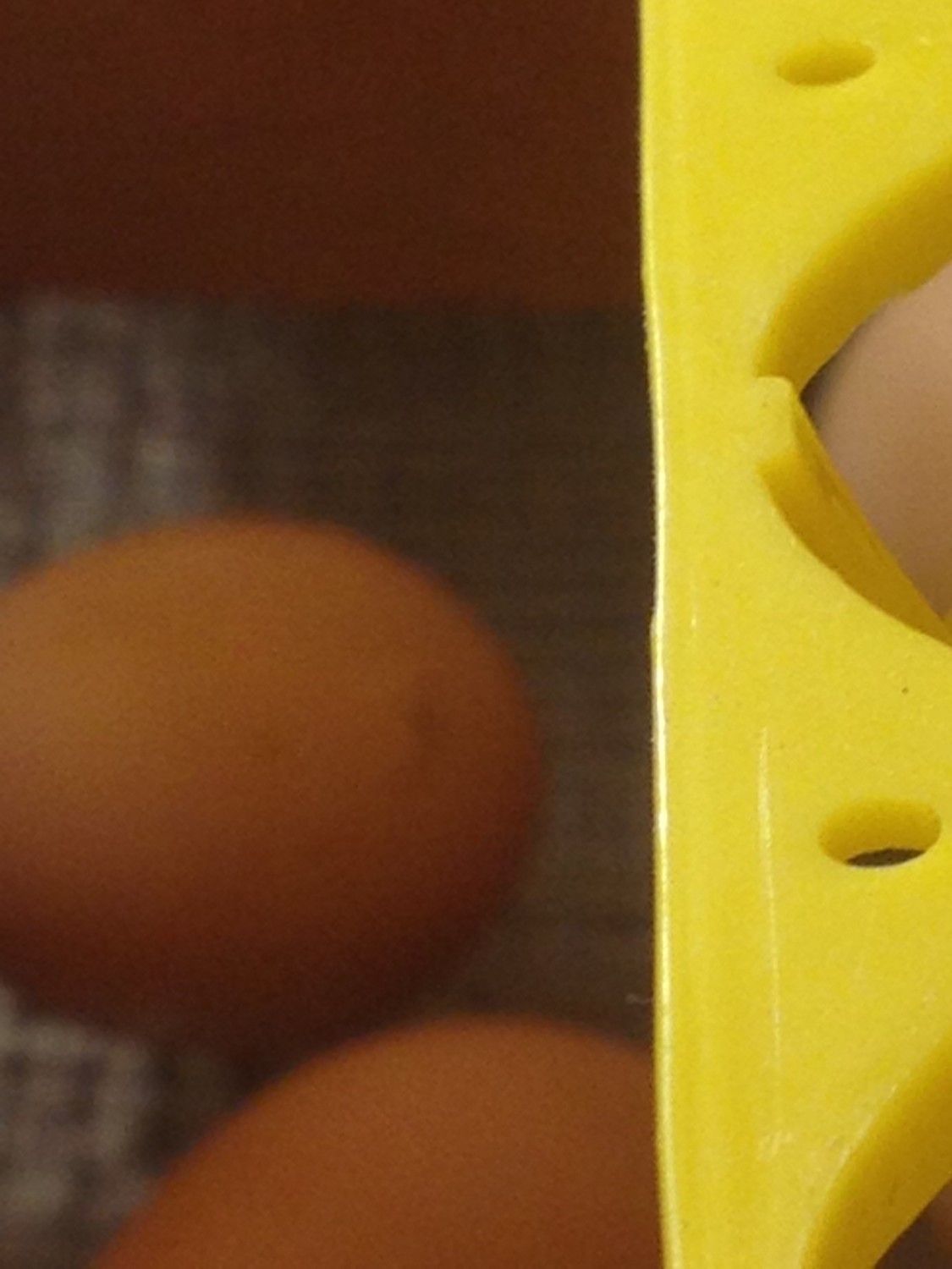 Yay, Day 20 and 21Hrs. Just got back from shopping and one egg has pipped. Humidity was at 64%. I opened up the air intake a little more and am bumping up humidity. What should I aim for? 70%? The dirty looking spot on the right side of the egg is the pip. Hard to zoom through plexiglass.