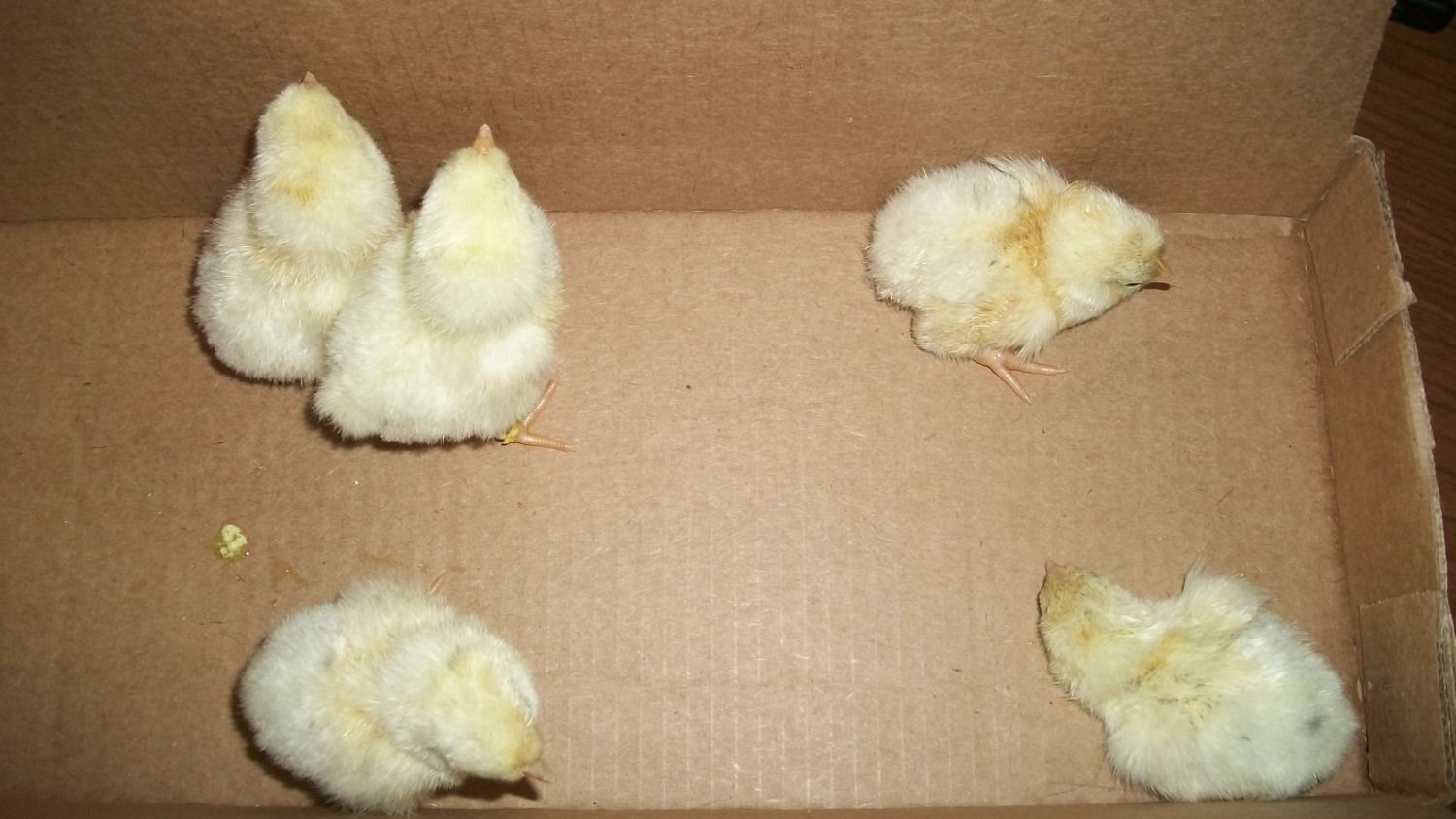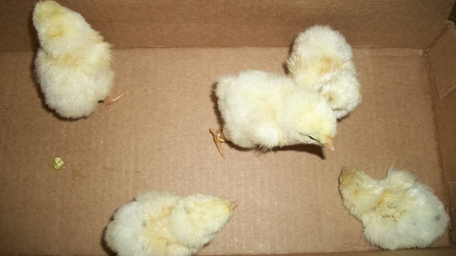 3 eggs WSBEL (white egg) = super blue egg layer = white sport legbar rooster x white leghorn (will hatch yellow) all three hatched all yellow one had patch of black feathers on leg.