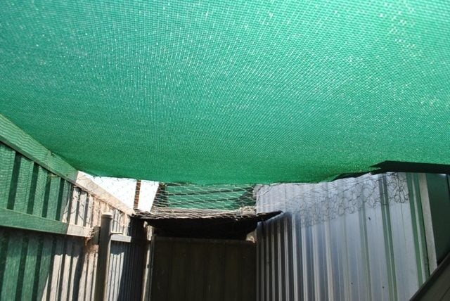 This shows how it is full enclosed with chicken wire and shade cloth. The shade cloth is 90% sun block-out. The black canvas we have just put back up this week to keep them cooler - it just clips over the chicken wire there. They love to dig and dust bathe down there - very cool soil.