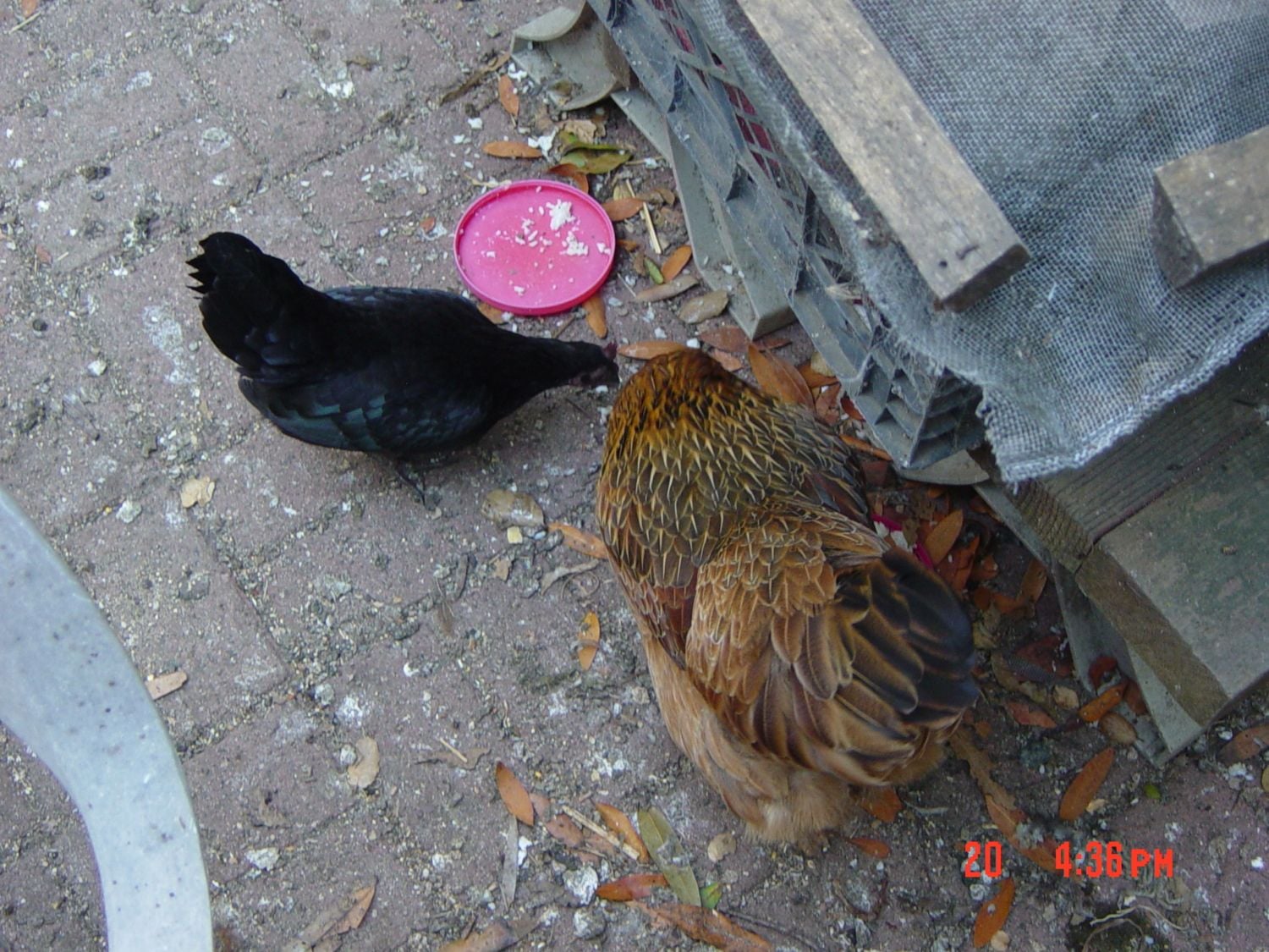Here they are sharing a treat together. They are both over a year old so the black one must be a bantam.