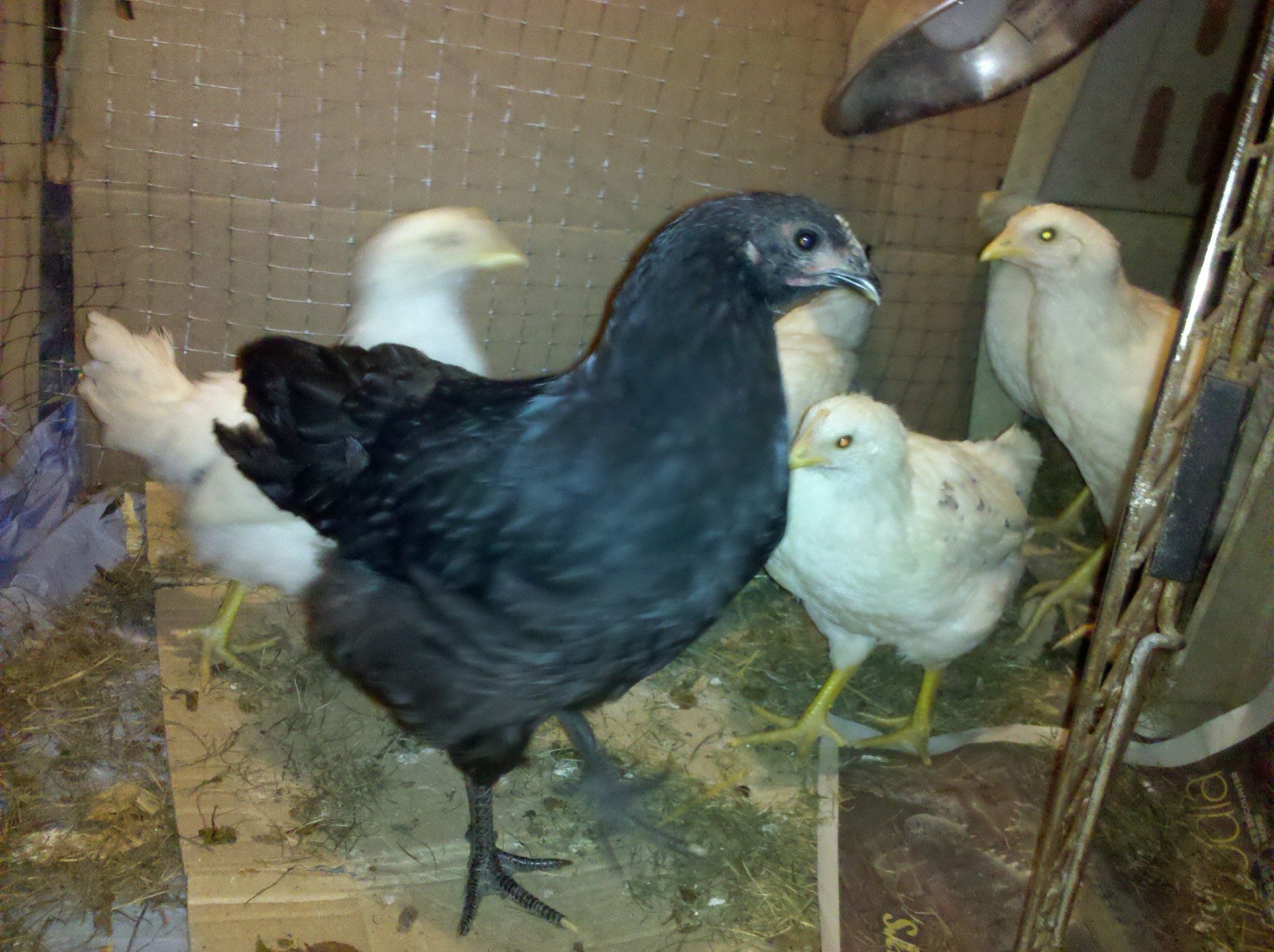According to the woman they hand raised them in the house starting some day in March 2015. I believe her as the EE in particular is very friendly, lets me approach her, pick her up etc. The little black one is more skittish toward me but not scared of the other chickens so much.