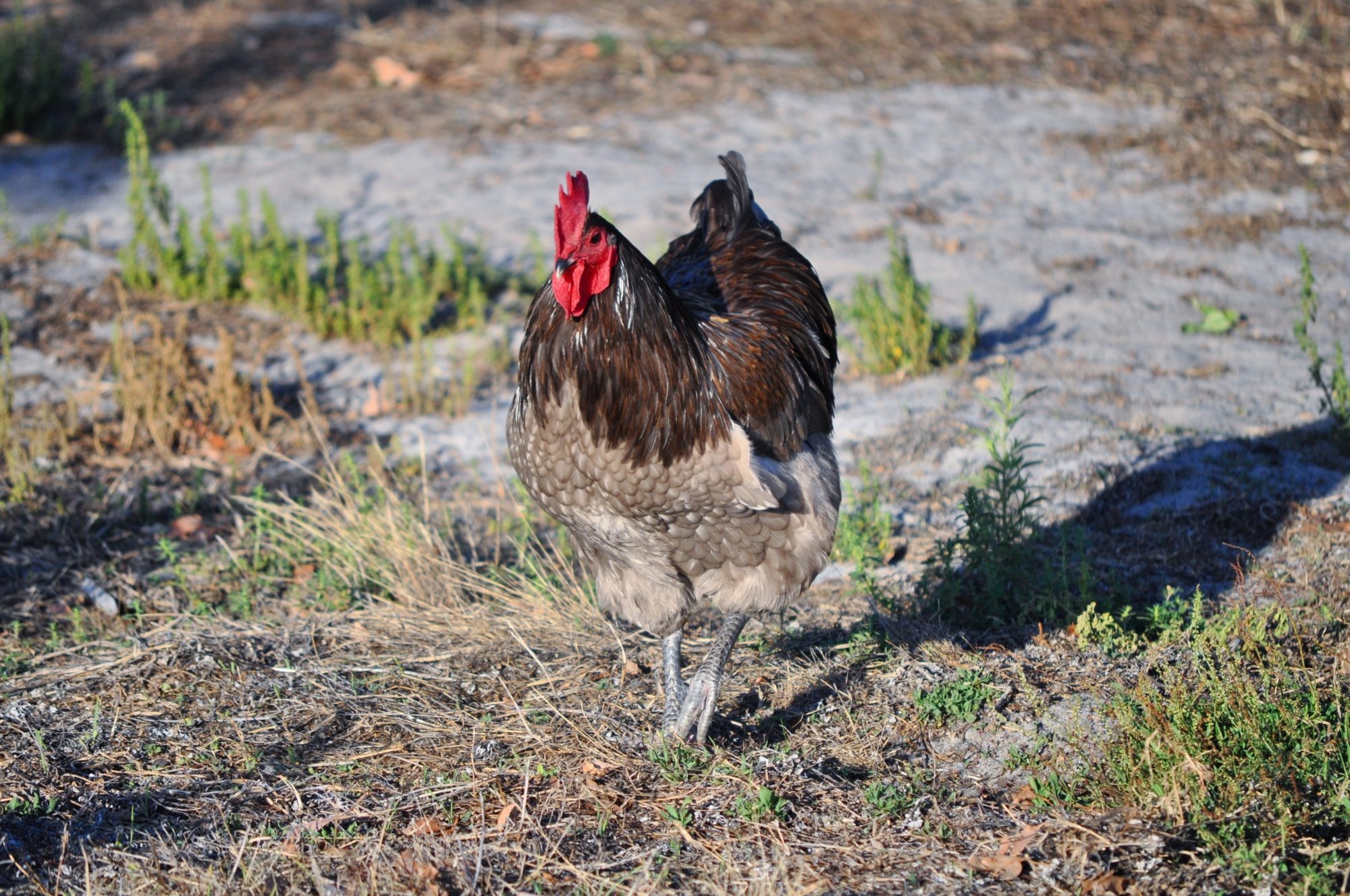 No red leakage but sun bleaching yes... his sickles and hachles turn a brassy colour. He has removed feathers on that particular hen which makes he look like she has a massive tail