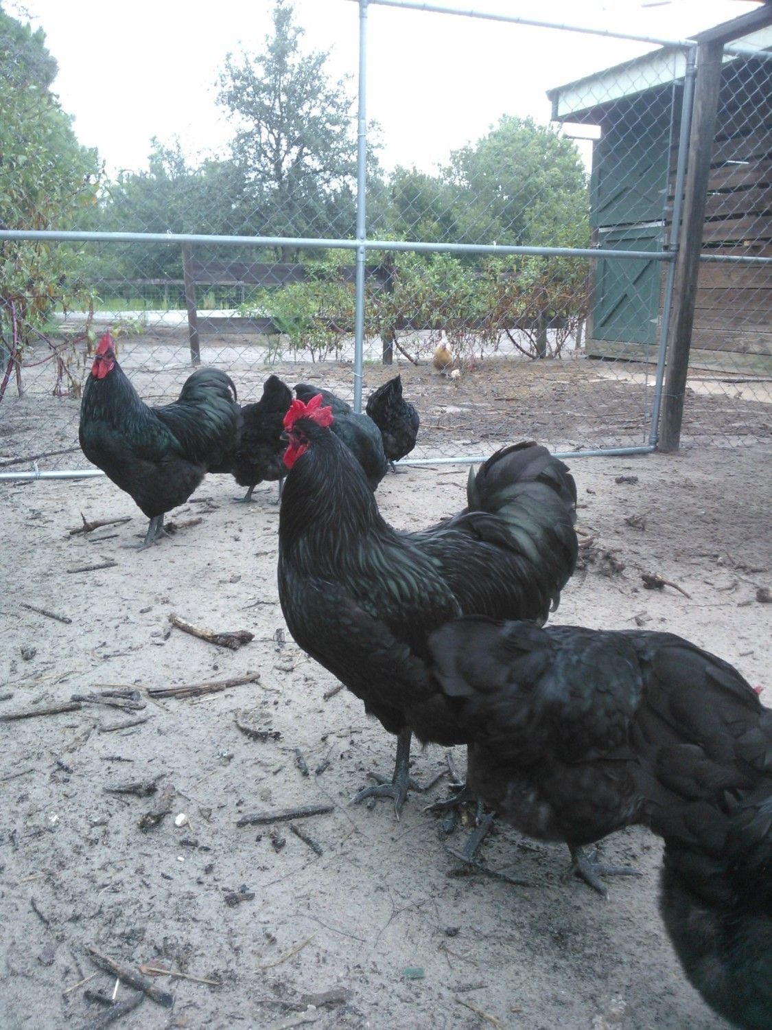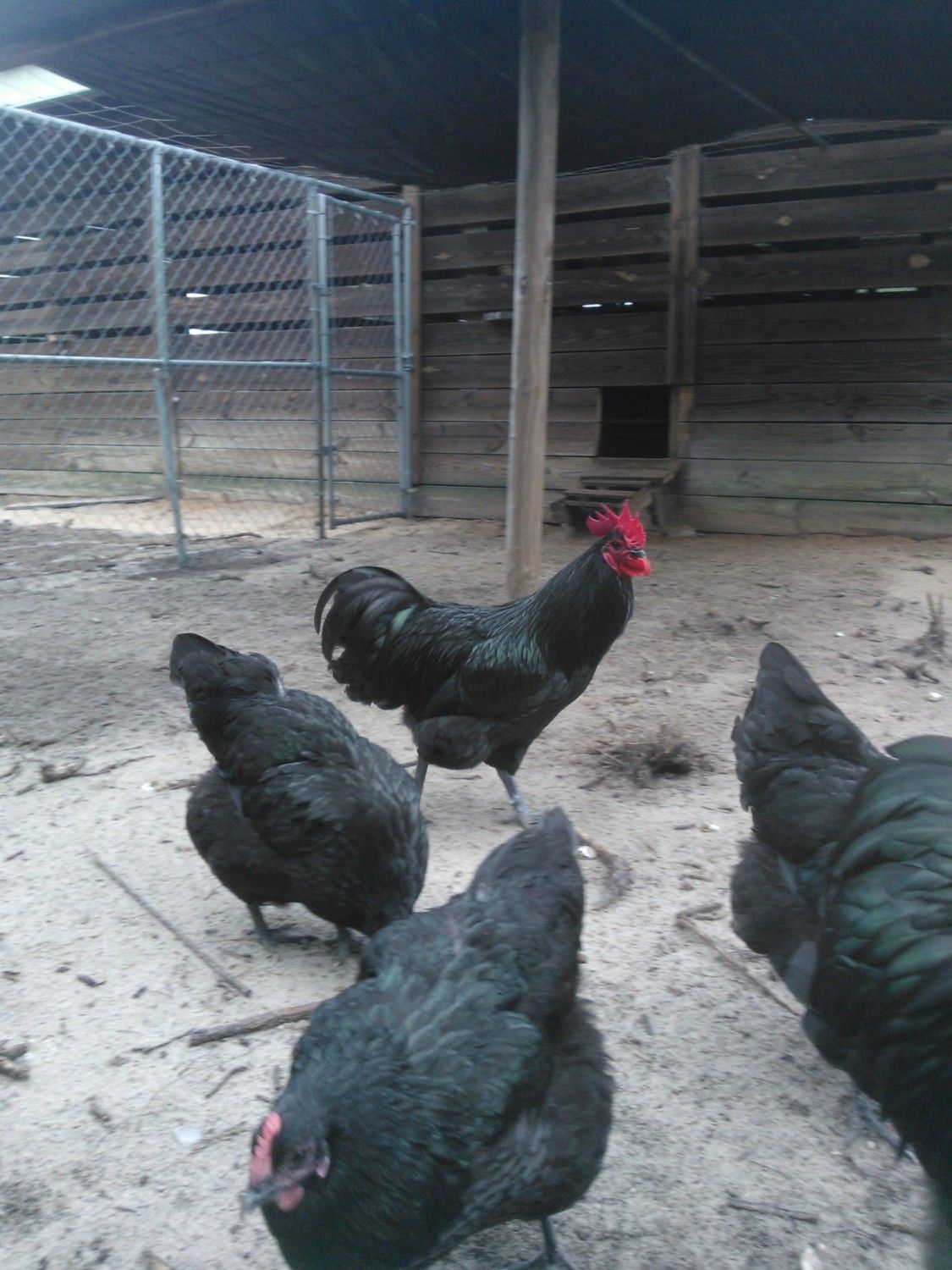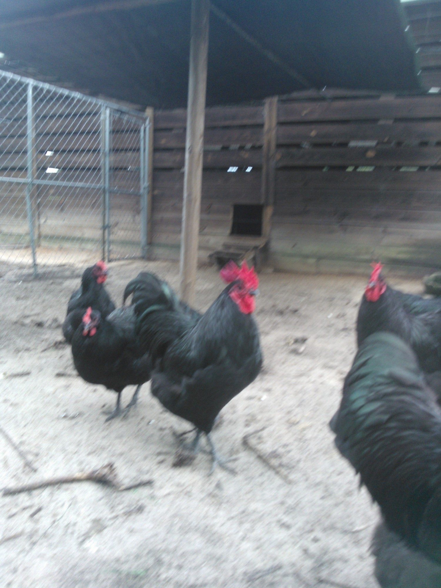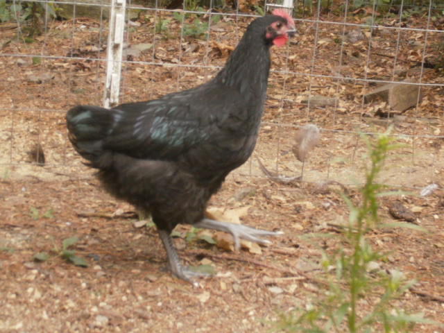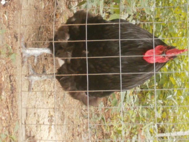 it's so hard to get the buggers to strike the right pose,eh? They seem to have nice sheen and nice dark legs and I agree about the eyes, Aveca. I hope your fussy girls go somewhere like this. The birds sooo remind me of our purebred Utility Aussies - the tail and face especially. It's only exhibition birds here that have the 'solid', rounded tails and clean, smooth faces just like the wattles and combs. There may be purebred Utility strains with clean faces that I've not come across but most are plum-colored, and I'm pretty sure they all have 'your' tails.When they were breeding 'up' to a bird suitable for a Standard to be accepted, they added to the Utility strains and if you look at pics of how the bird has been 'improved', it's the tail that's most obvious. They start off looking like yours. I'm convinced that more Orp. was added, some Cook-type, which appears to be 'extinct' both here and there, and some Partington, which has led to our 'too big ,too loose in the feather and too fluffy-thighed exhibition chooks - the sort of problems you commented on in American attempts to add some Orp. to your Aussies, Aveca. The 'too big' can be solved. A lot of our problems stem from attitudes expressed by 'gurus' such as Ray Conner, where they advise judges to favor the bigger bird because " It's harder to breed bigger ones." Old Ray, in my opinion,gets a bit schizo. his comments - caugt between Ray the Australorp breed-lover and Ray the ultra competitor for the 'glittering prizes'. For example, he says that he doesn't like to see thigh fluff from directly above a bird, but look at his prize-winners! I still think it's worth tring adding some Orp. as some are doing there. Aveca, ur negative opinions of these attempts based on the first cross or subsequent culling and breeding back to reduce the Orp. influence?
