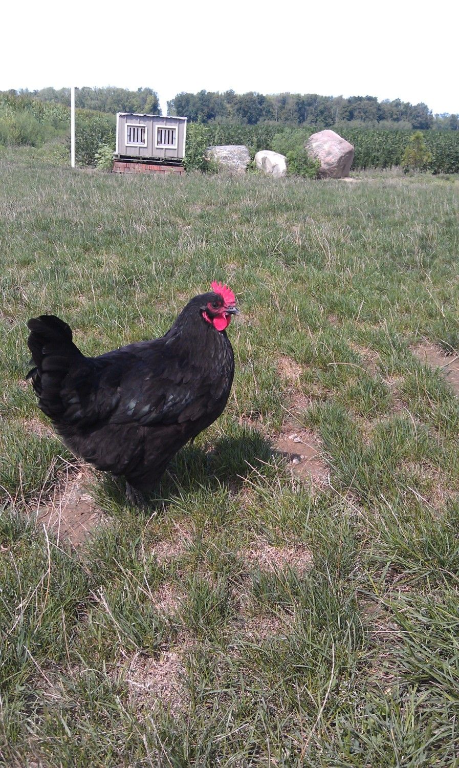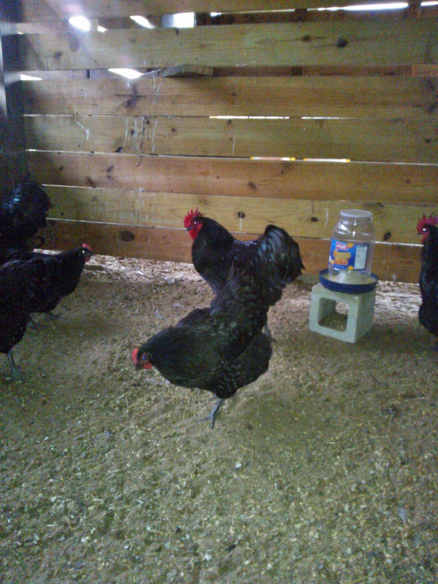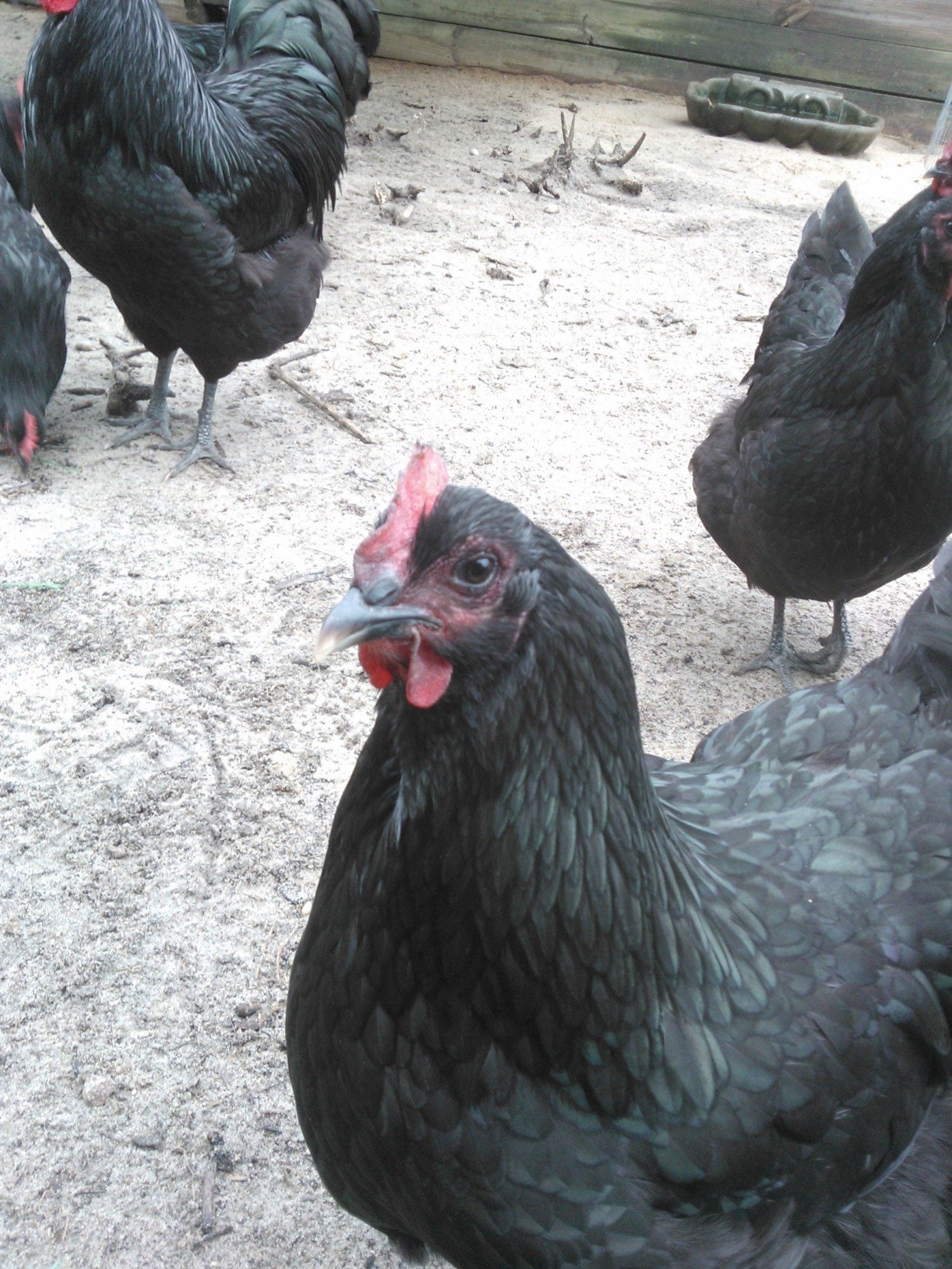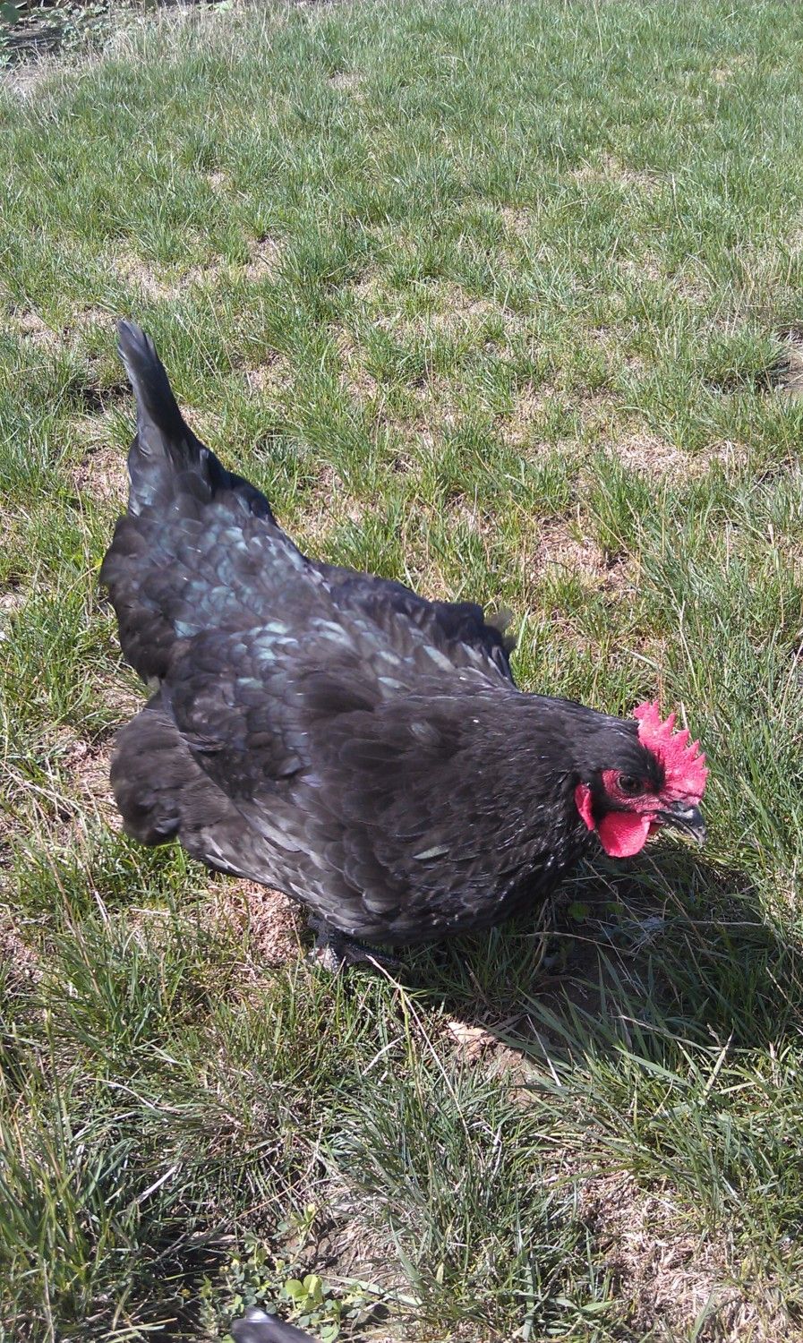 it's so hard to get the buggers to strike the right pose,eh? They seem to have nice sheen and nice dark legs and I agree about the eyes, Aveca. I hope your fussy girls go somewhere like this. The birds sooo remind me of our purebred Utility Aussies - the tail and face especially. It's only exhibition birds here that have the 'solid', rounded tails and clean, smooth faces just like the wattles and combs. There may be purebred Utility strains with clean faces that I've not come across but most are plum-colored, and I'm pretty sure they all have 'your' tails.When they were breeding 'up' to a bird suitable for a Standard to be accepted, they added to the Utility strains and if you look at pics of how the bird has been 'improved', it's the tail that's most obvious. They start off looking like yours. I'm convinced that more Orp. was added, some Cook-type, which appears to be 'extinct' both here and there, and some Partington, which has led to our 'too big ,too loose in the feather and too fluffy-thighed exhibition chooks - the sort of problems you commented on in American attempts to add some Orp. to your Aussies, Aveca. The 'too big' can be solved. A lot of our problems stem from attitudes expressed by 'gurus' such as Ray Conner, where they advise judges to favor the bigger bird because " It's harder to breed bigger ones." Old Ray, in my opinion,gets a bit schizo. his comments - caugt between Ray the Australorp breed-lover and Ray the ultra competitor for the 'glittering prizes'. For example, he says that he doesn't like to see thigh fluff from directly above a bird, but look at his prize-winners! I still think it's worth tring adding some Orp. as some are doing there. Aveca, ur negative opinions of these attempts based on the first cross or subsequent culling and breeding back to reduce the Orp. influence?