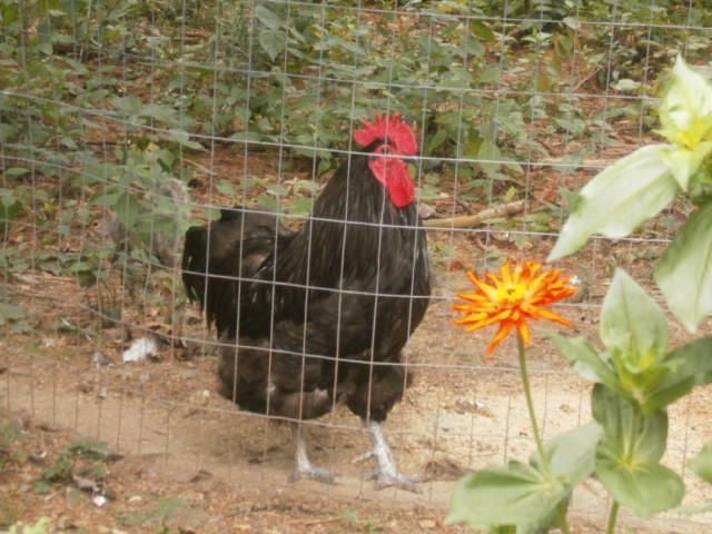 I went out this morning and took a stab at taking a few pics..well its what it is...I powdered ben the aussie rooster last night..I periodically do that because the wild birds bring stuff in..so the powdery marks are poultry dust from me..plus hes a little fluffed up from the rubbing it in part...Ben has his own habitat lot like a zoo specimine..its huge, and it has rained a lot and the weeds are coming back..he munchs a lot of them so I like to leave some in there for him..